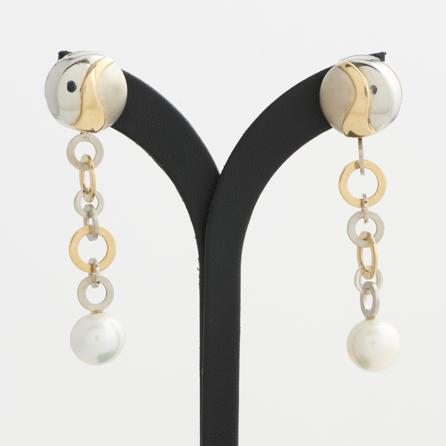 A PAIR OF PEARL DROP EARRINGS IN 18CT TWO-TONE GOLD, THE PEARLS MEASURING APPROXIMATELY 12MM, TO POST AND CLIP FITTINGS, LENGTH 57MM