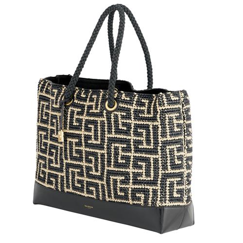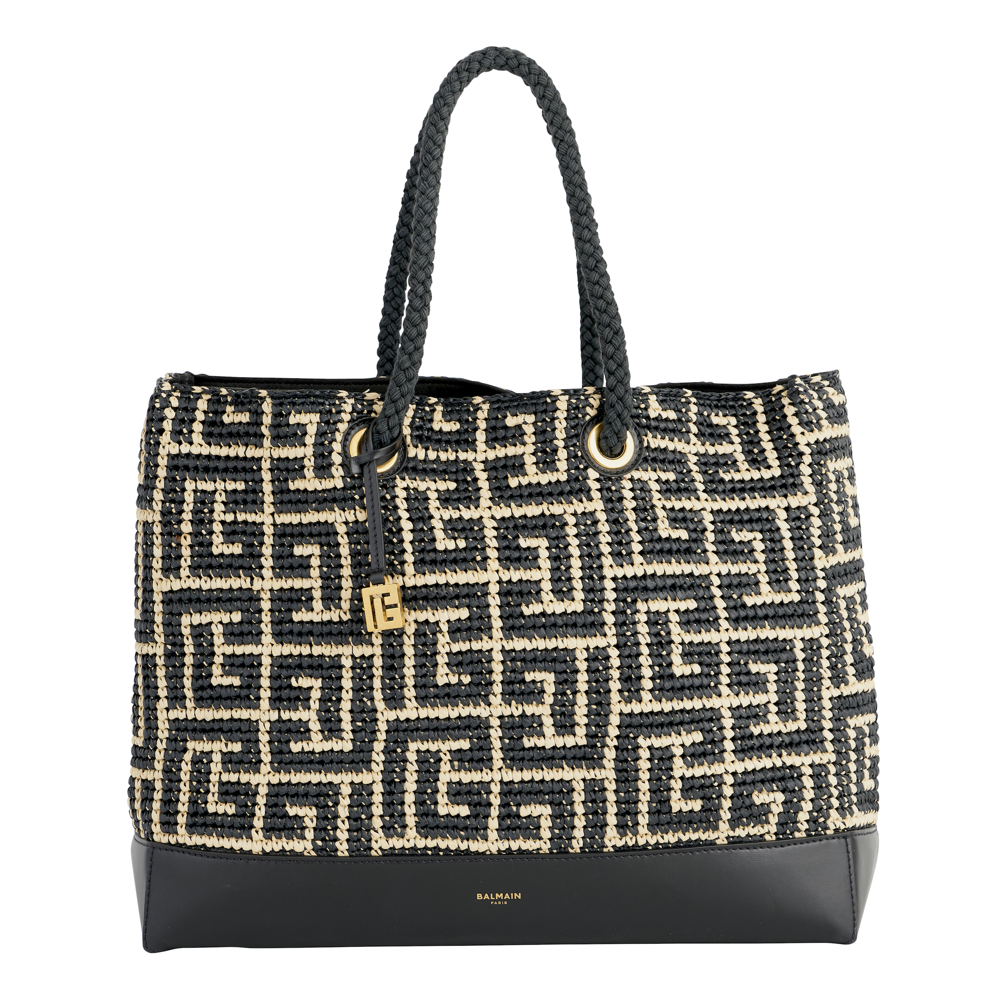 Styled in black and natural monogram woven raffia with gold tone hardware and black leather base, featuring dual plaited shoulder straps and gold tone hardware, 33 x 42 x 14cm.