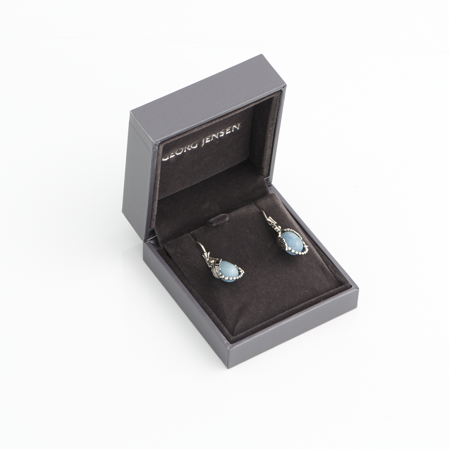 GEORGE JENSEN, A PAIR OF HERITAGE BLUE QUARTZ EARRINGS IN STERLING SILVER, TO SHEPHERD HOOK FITTINGS, 30MM, ACCOMPANIED BY A GEORG JENSEN BOX