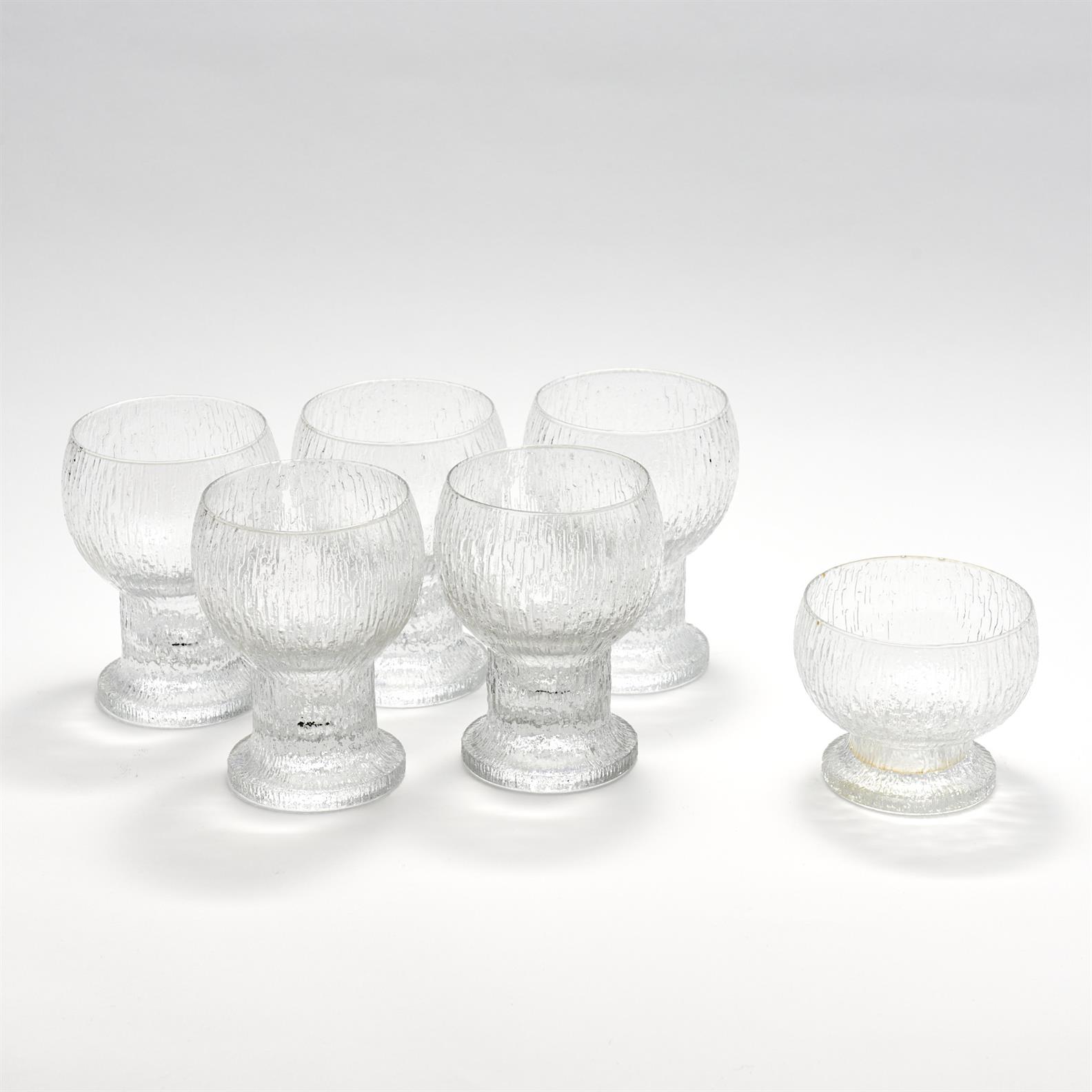 A COLLECTION OF FIVE LARGE IITTALA KEKKERIT GLASSES BY TIMO SARPANEVA WITH MATCHING BOWL, MADE IN FINLAND H.14CM (TALLEST), LEONARD JOEL DELIVERY SIZE: MEDIUM