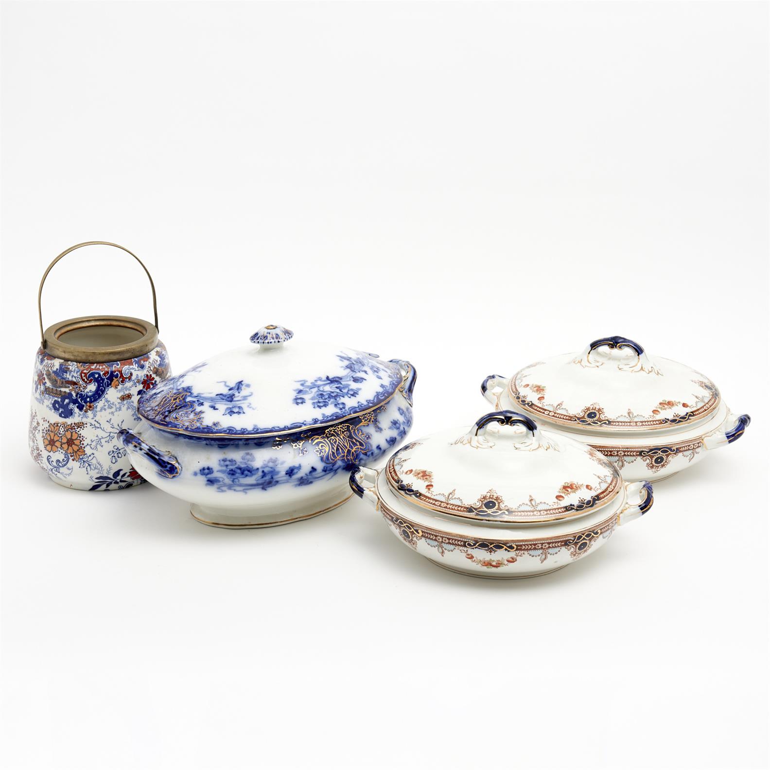 A GROUP OF ENGLISH PORCELAIN INCLUDING A GRIMWADES TUREEN ALONG WITH A PAIR OF BELMONT TUREENS AND A BISCUIT BARREL W.31CM (LARGEST) (A/F), LEONARD JOEL DELIVERY SIZE: LARGE