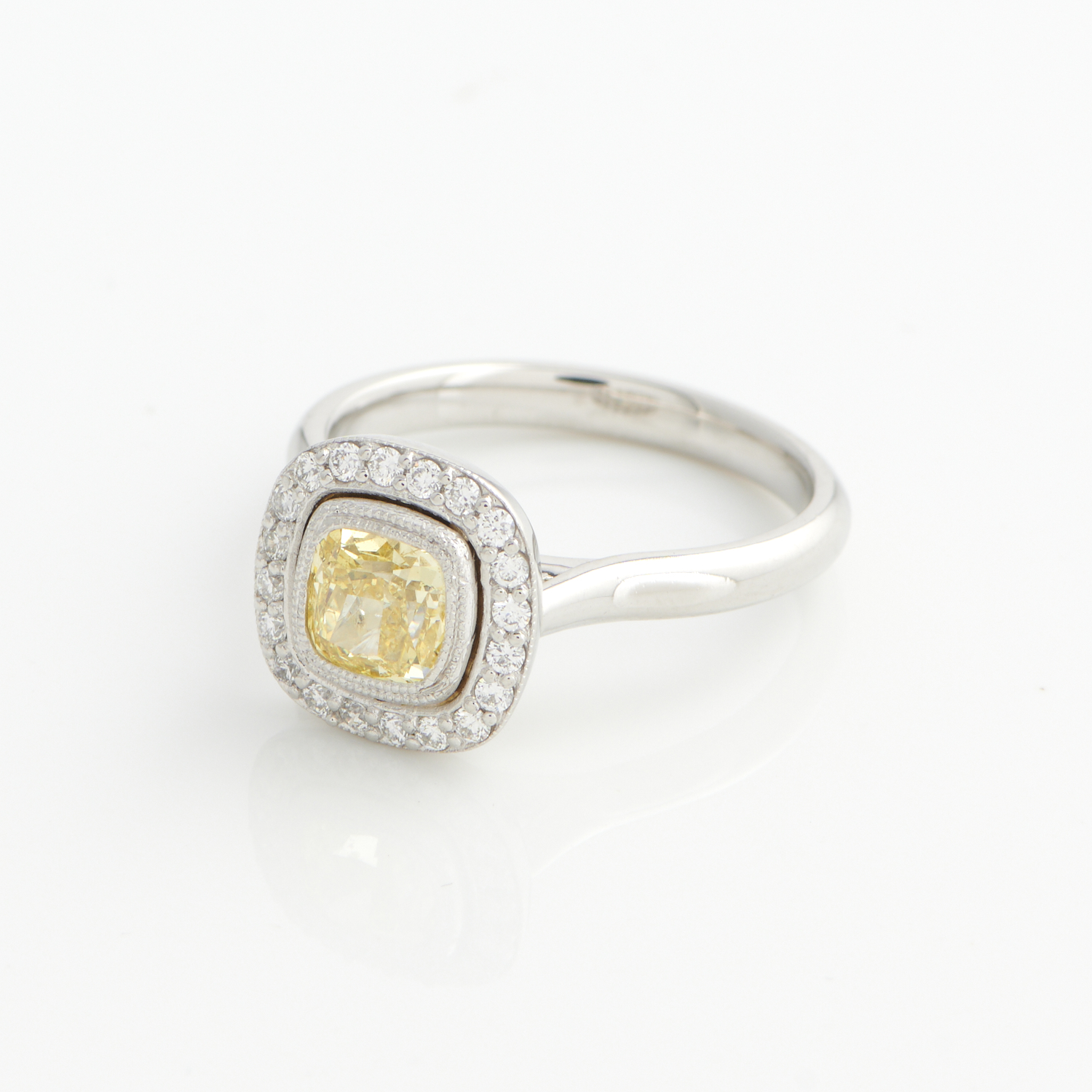 A DIAMOND RING IN PLATINUM, THE FANCY YELLOW DIAMOND WEIGHING 1.02CTS, THE DIAMONDS TOTALLING 0.22CTS, SIZE M, 7.5GMS, ACCOMPANIED BY A GIA DIAMOND REPORT