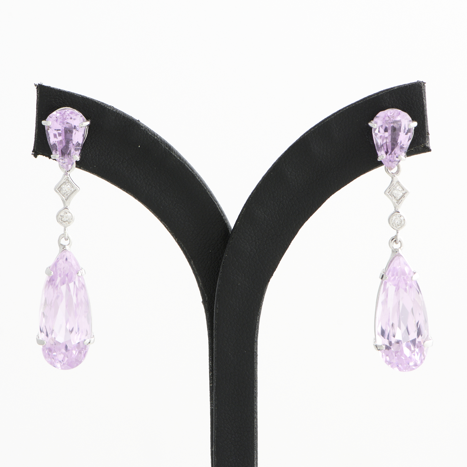 A PAIR OF KUNZITE AND DIAMOND EARRINGS IN 18CT WHITE GOLD, THE KUNZITE TOTALLING 36.40CTS, TO POST AND BUTTERFLY FITTINGS