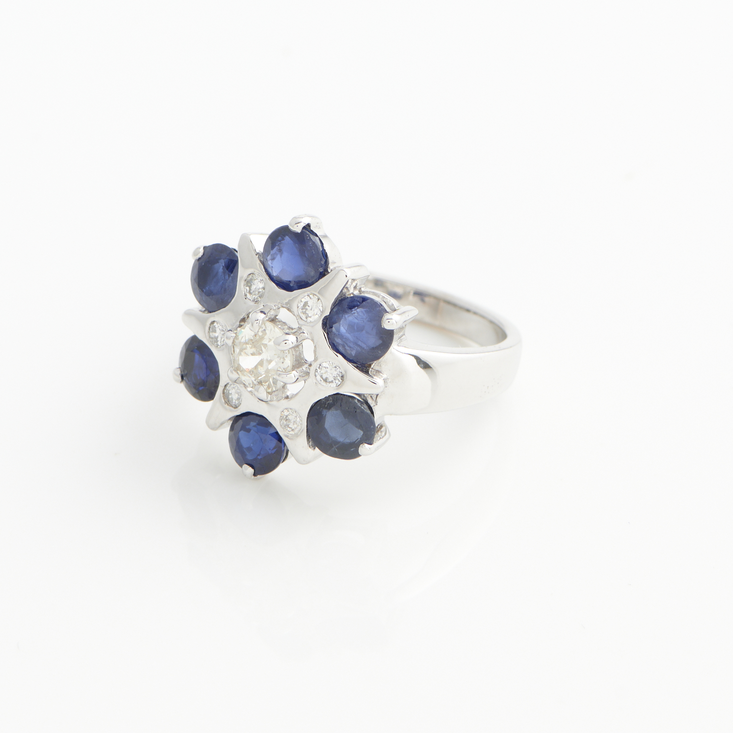 A SAPPHIRE AND DIAMOND RING IN 18CT WHITE GOLD, THE SAPPHIRE WEIGHING 2.90CTS, THE DIAMONDS TOTALLING 0.46CTS, SIZE N, 5.7GMS