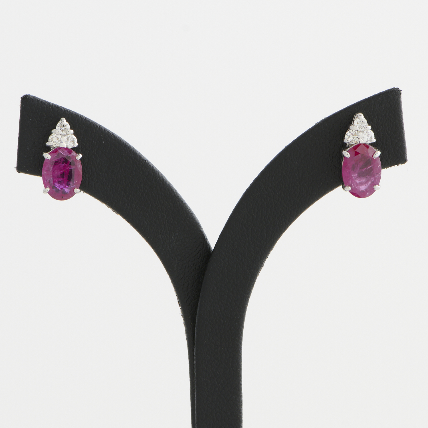 A PAIR OF MOZAMBIQUE RUBY AND DIAMOND EARRINGS IN 18CT WHITE GOLD, THE RUBIES TOTALLING 2.60CTS, THE DIAMONDS TOTALLING 0.20CTS, TO POST AND BUTTERFLY FITTINGS, LENGTH 12MM