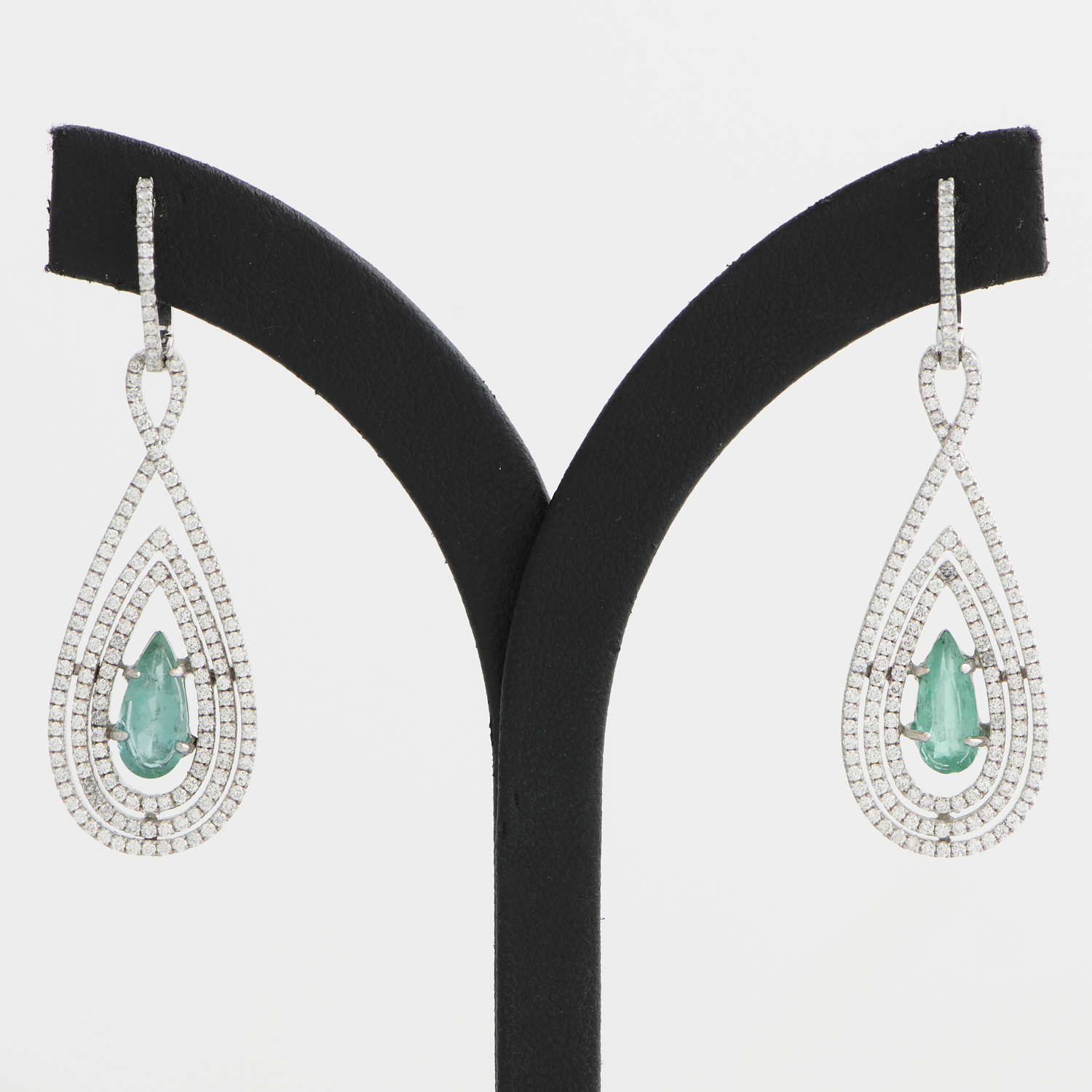 A PAIR OF EMERALD AND DIAMOND EARRINGS IN 18CT WHITE GOLD, THE EMERALDS TOTALLING 2.00CTS, THE DIAMONDS TOTALLING 2.70CTS, TO POST AND HINGE FITTINGS, LENGTH 50MM, 10.0GMS, ACCOMPANIED BY A VALUATION
