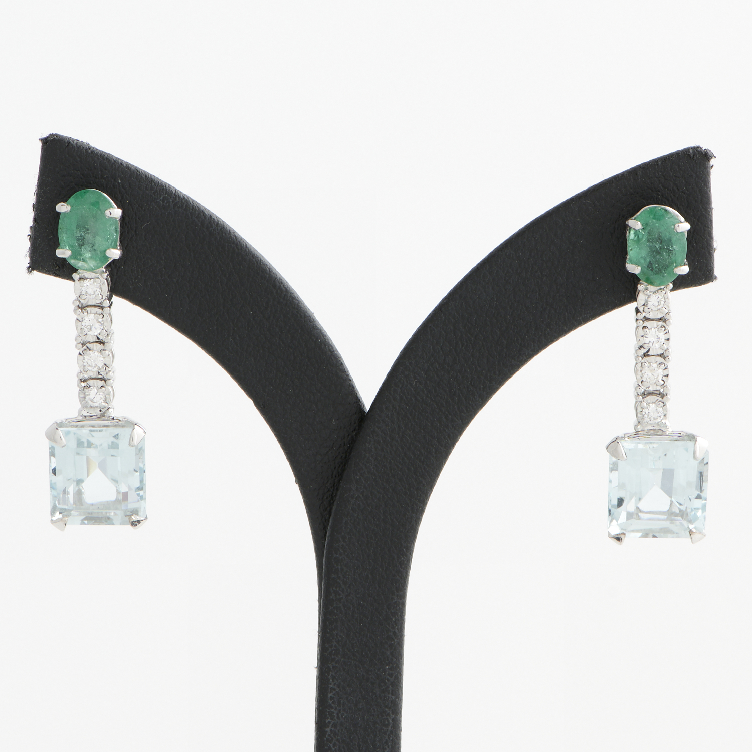A PAIR OF EMERALD, AQUAMARINE AND DIAMOND EARRINGS IN 18CT WHITE GOLD, THE EMERALDS TOTALLING 5.90CTS, THE DIAMONDS TOTALLING 1.62CTS, TO POST AND BUTTERFLY FITTINGS, 30MM, ACCOMPANIED BY A VALUATION