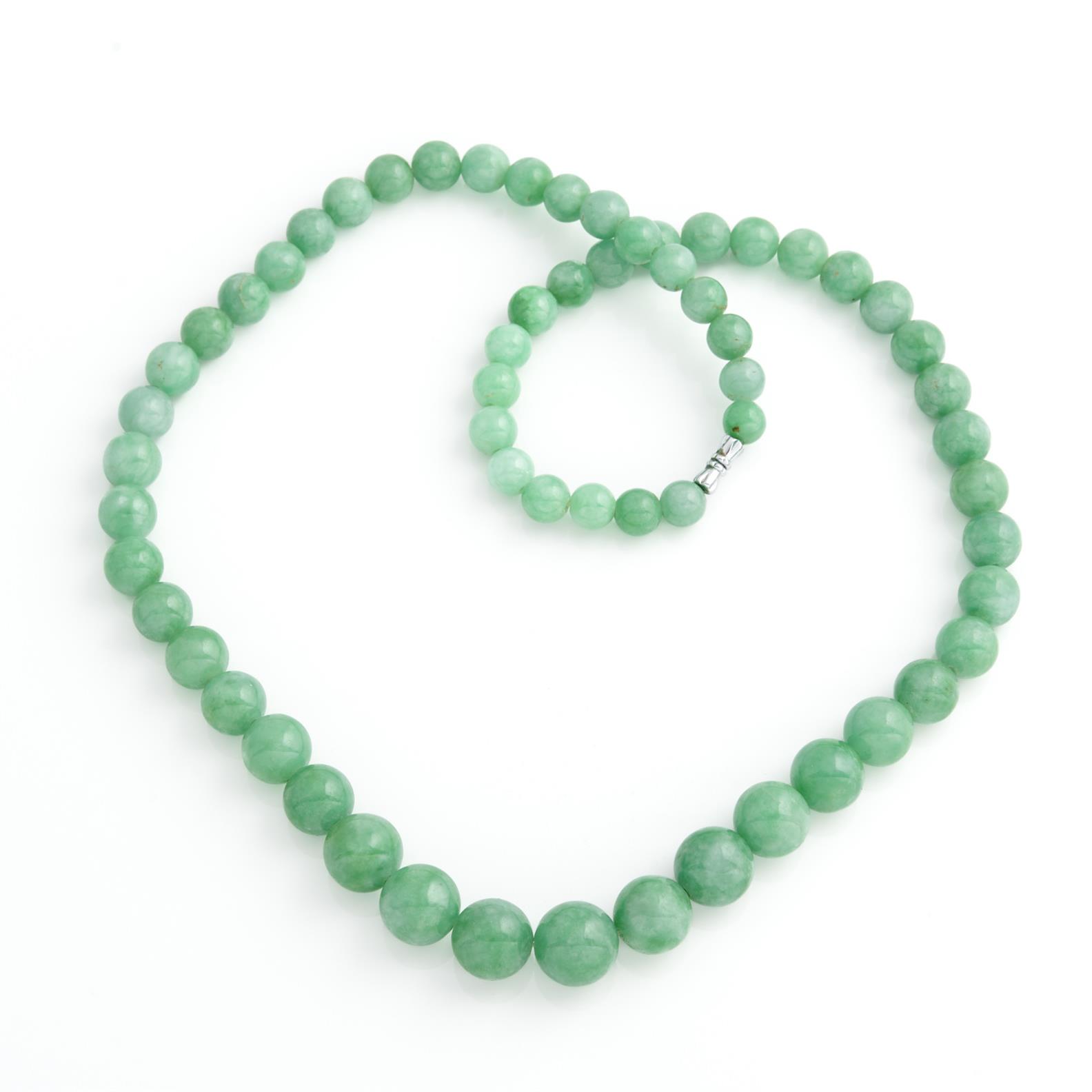 A STRAND OF JADEITE BEADS, THE BEADS MEASURING 9MM-15MM, 660MM