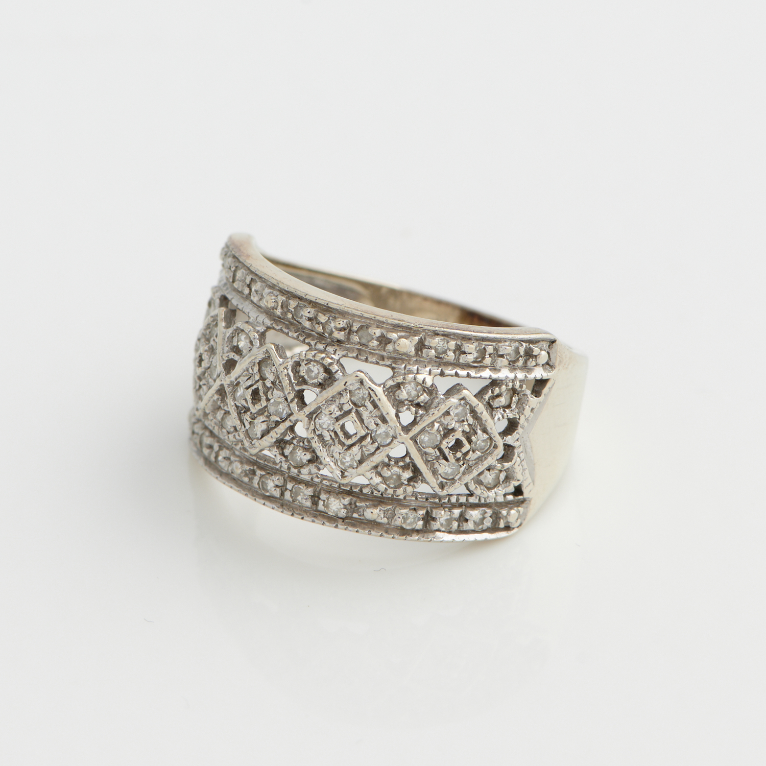 A DIAMOND OPENWORK RING IN 9CT WHITE GOLD, SIZE N, 3.9GMS