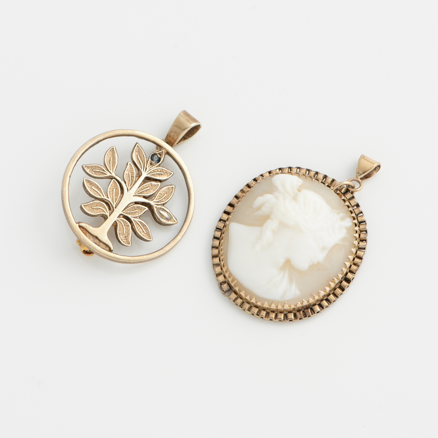 A CAMEO PENDANT IN 9CT GOLD, 25MM X 28MM, TOGETHER WITH A TREE BROOCH/PENDANT IN SILVER GILT, DIAMETER 22MM, 9.4G,S