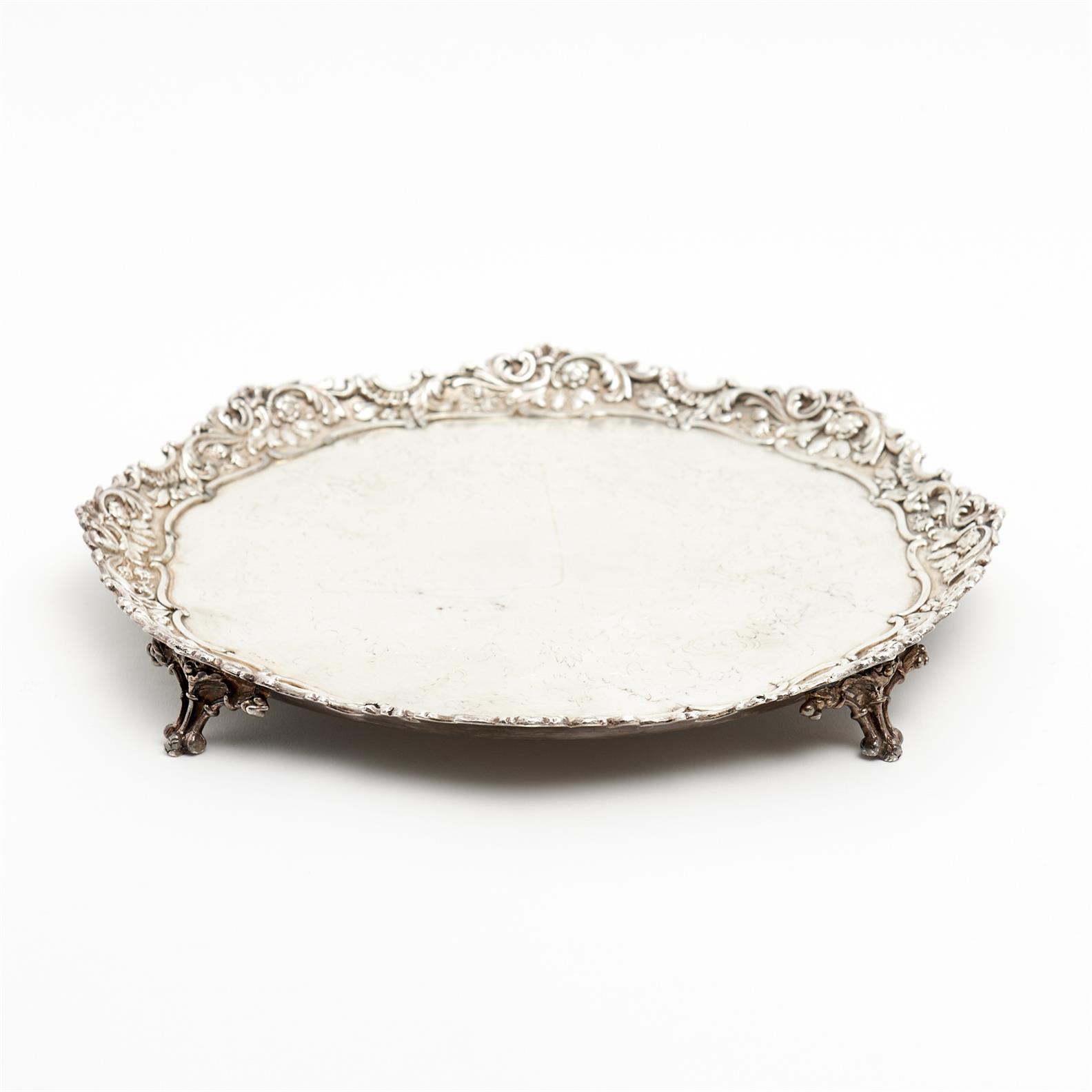 A VICTORIAN SILVER PLATE SALVER WITH DECORATIVE PIECRUST BORDER W.30CM, LEONARD JOEL DELIVERY SIZE: MEDIUM