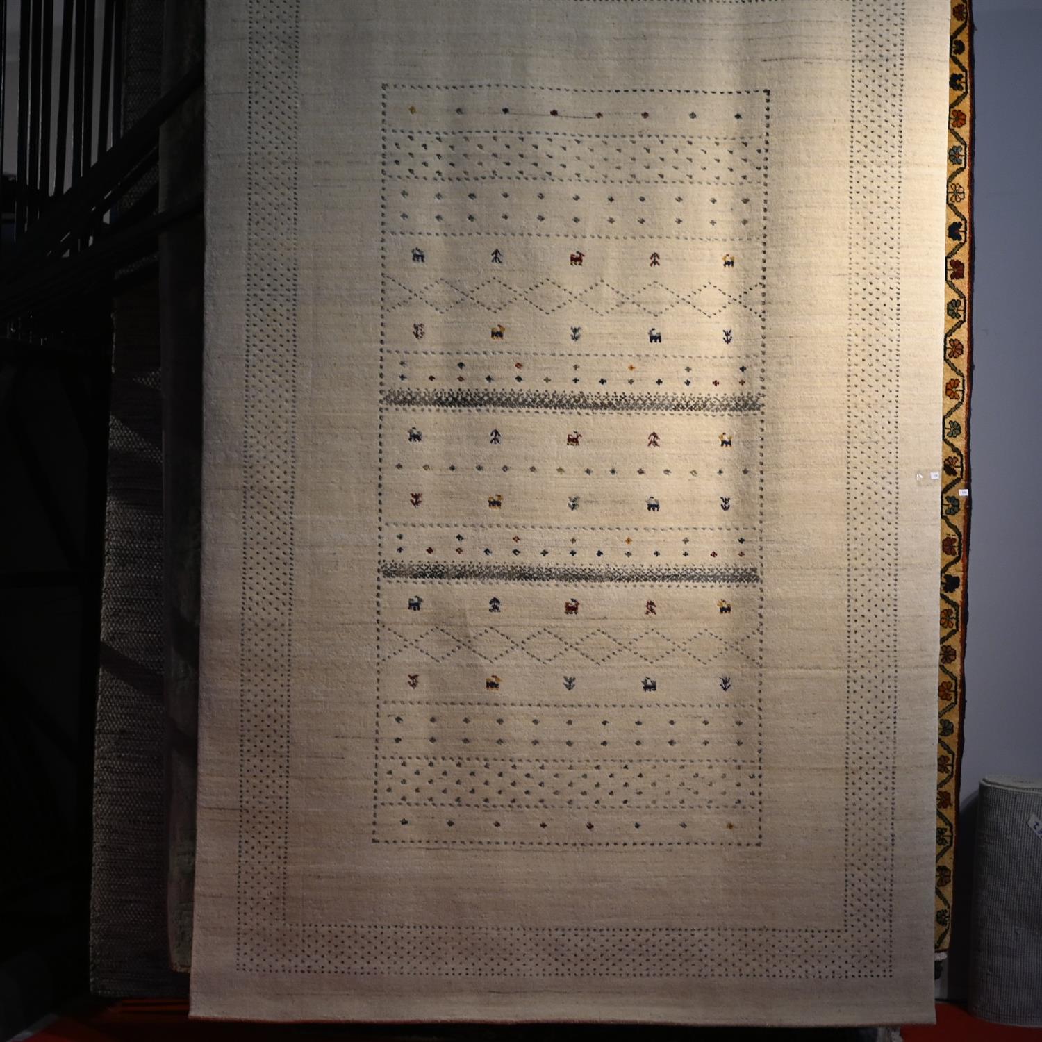 A NEW PERSIAN GABBEH LORIBAFT DESIGN WOVEN WITH 100% FINEST WOOLLEN PILE HAND LOOM KNOT IN MOTIFS OF DESSERT SHRUBS, LLAMAS, AND MOUNTAIN GOATS, THE GROUND OF NATURAL WOOL COLOUR WITH HIGHLIGHTS OF RED, GREEN, GOLD, AND GREY. ORIGIN: JAIPUR   WITH A NEW ANTI-SLIP UNDERLAY. (304 X 203 CM) (LEONARD JOEL DELIVERY SIZE: X-LARGE)