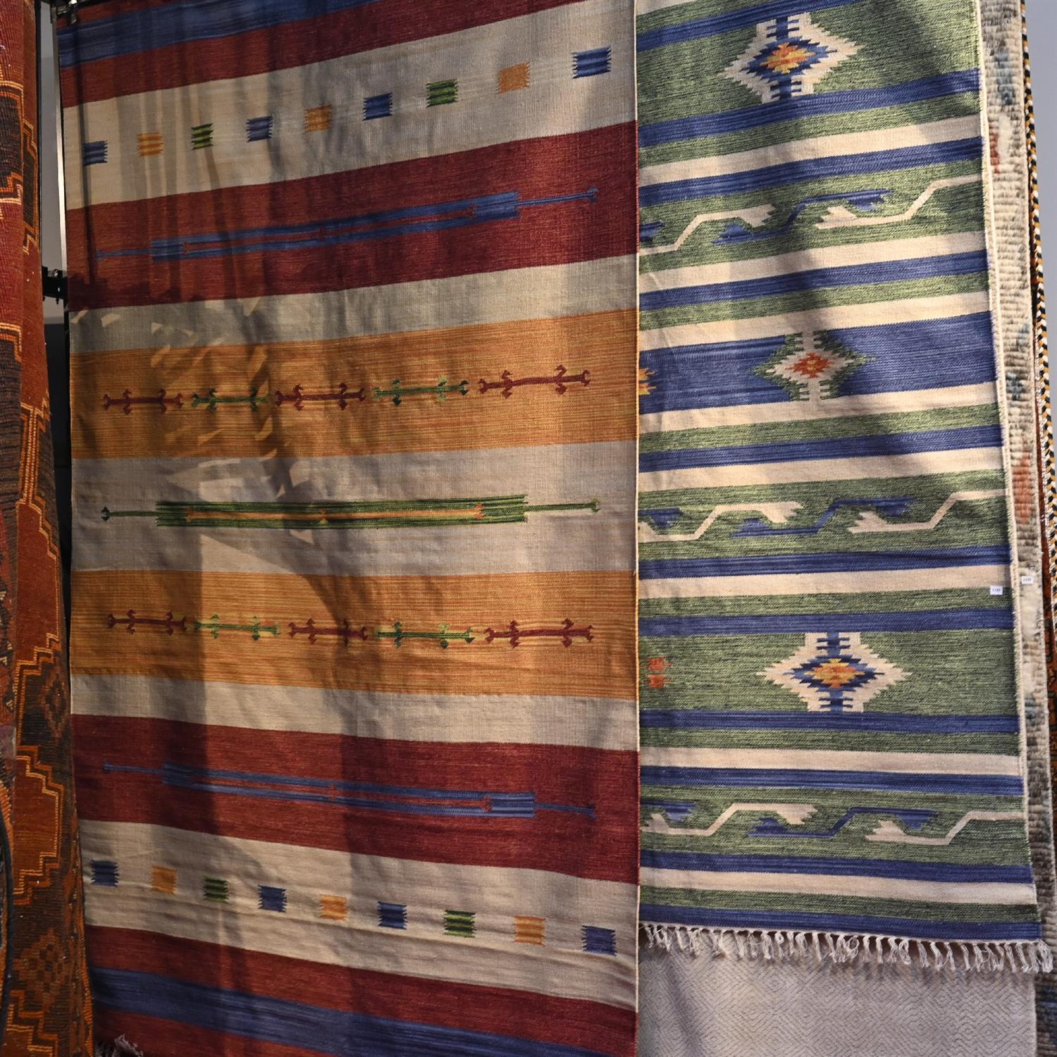 TWO NEW KAZAK-STYLE KILIMS, BOTH REVERSIBLE, GEOMETRIC NOMADIC MOTIFS IN TONES OF MELLOW COLOURS WOVEN WITH A SOFT CHANEEL TEXTURE. ORIGIN: AGRA INDIA (290 X 1170 CM & 240CM X 170 CM) (LEONARD JOEL DELIVERY SIZE: LARGE)