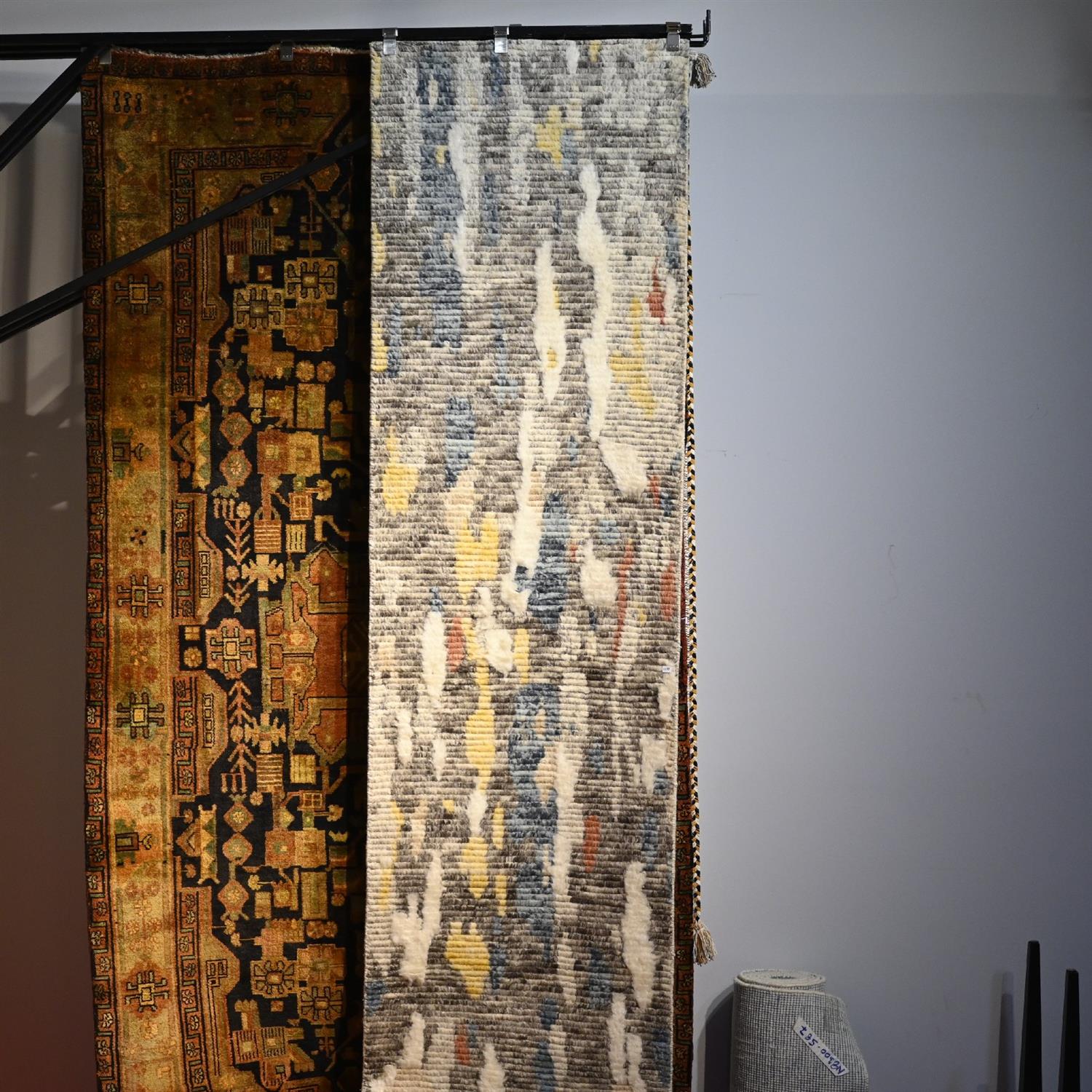 A NEW MORROCAN DESIGN HALL RUNNER, HAND KNOTTED WITH SOFT 100% FINE WOOLEN PILE WITH A DESIGN IN TONES OF TEAL BLUE, SILVER, GREY AND MUSTARD. ORIGIN: JAIPUR (406X 82 CM) (LEONARD JOEL DELIVERY SIZE: LARGE)