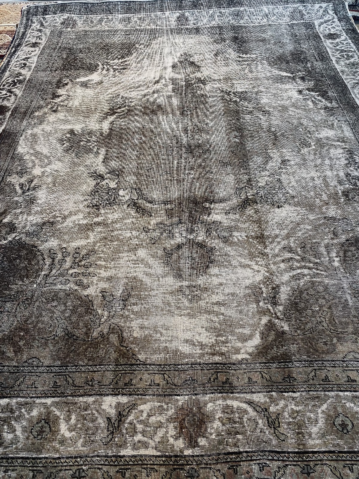 AN OVER-DYED HAND-KNOTTED TABRIZ CARPET, 100% WOOLLEN PILE, IN TONES OF SILVER, GREY AND CHARCOAL WITH A MIX OF TRADITIONAL AND MODERN MOTIFS THROUGHOUT. ORIGIN: PERSIA. WITH A NEW ANTI-SLIP UNDERLAY. (371 X 295 CM) (LEONARD JOEL DELIVERY SIZE: X-LARGE)