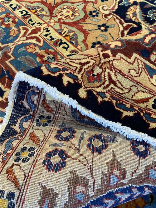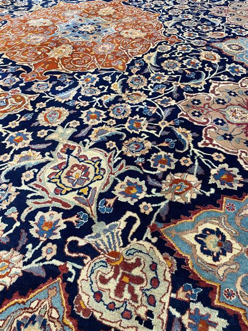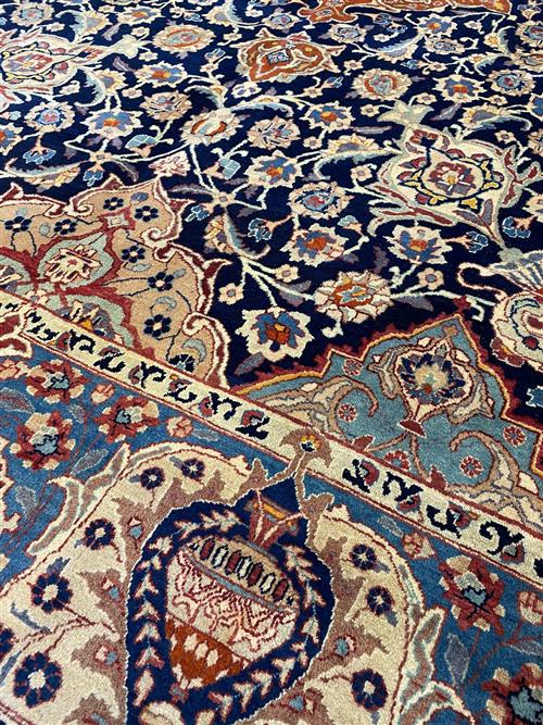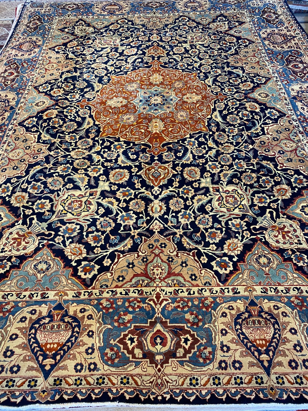 A LARGE PERSIAN TREASURE DESIGN KASHMAR CARPET, 100% WOOL, FINELY HAND-KNOTTED, A RICH DESIGN WITH A RED-GROUND MEDALLION WITHIN AN INDIGO FIELD SPRAYED WITH AN ALL-OVER FLORAL DESIGN, THE BORDER OF FRENCH BLUE AND CARAMEL ORIGIN: PERSIA, WITH A NEW ANTI-SLIP UNDERLAY (407 X 305 CM) (LEONARD JOEL DELIVERY SIZE: X-LARGE)