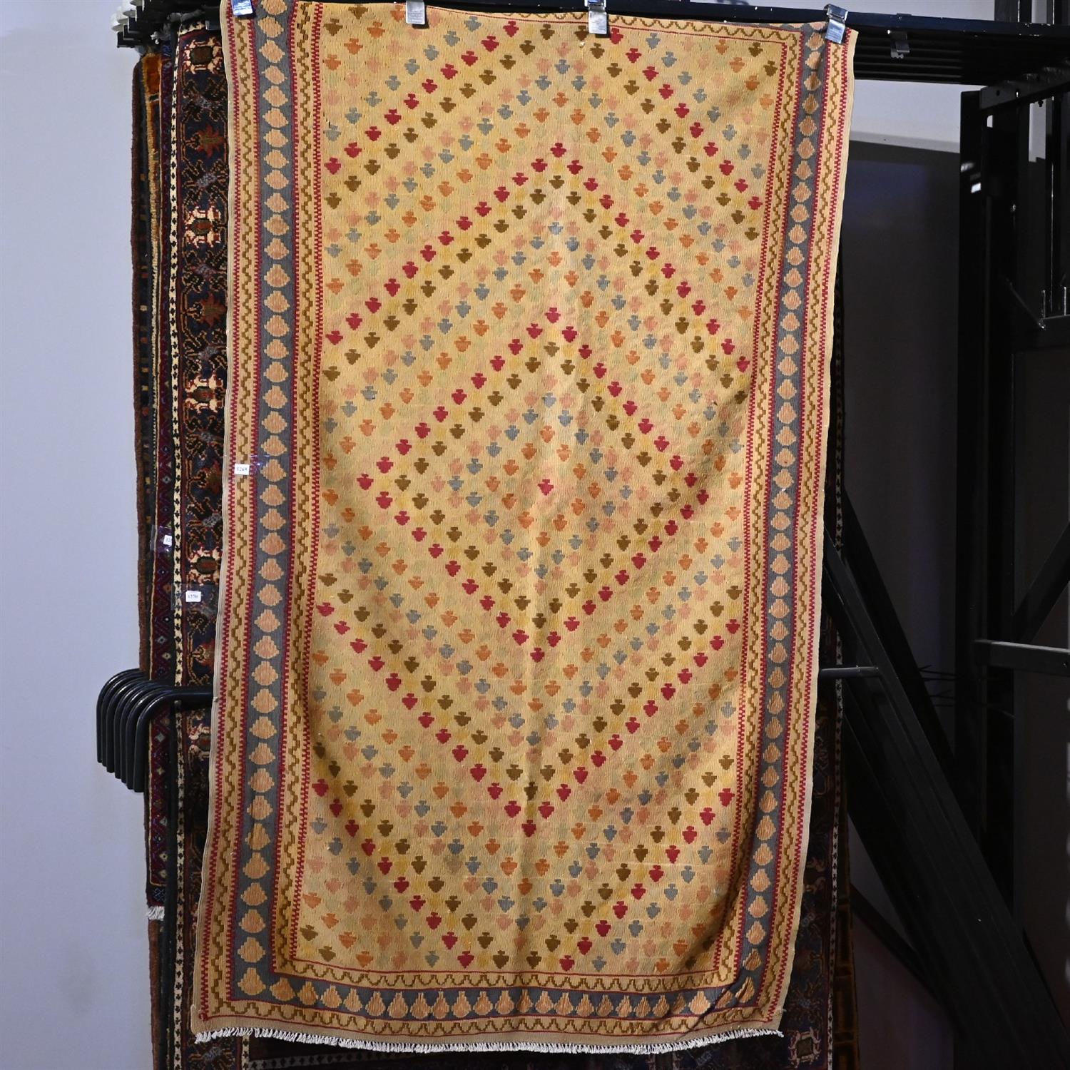 A 1970s PERSIAN SENNEH KILIM IN TONES OF CREAM, GOLD, CORAL, BLUE AND RED 100% WOOL WEAVE HAND MADE IN A GEOMETRICAL DIAMOND SHAPE MOTIFS. ORIGIN: PERSIA (200 X 115 CM) (LEONARD JOEL DELIVERY SIZE: LARGE)