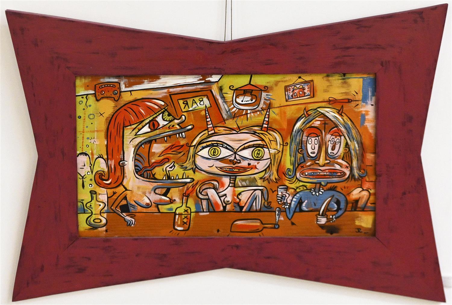 JEFF RAGLUS, BAD GIRLS (THE MANEATERS) 1997, ACRYLIC ON DOOR PANEL, TITLED VERSO, INITIALLED AND DATED LOWER RIGHT, 25.5 X 45CM, FRAME SIZE: 46 X 65CM