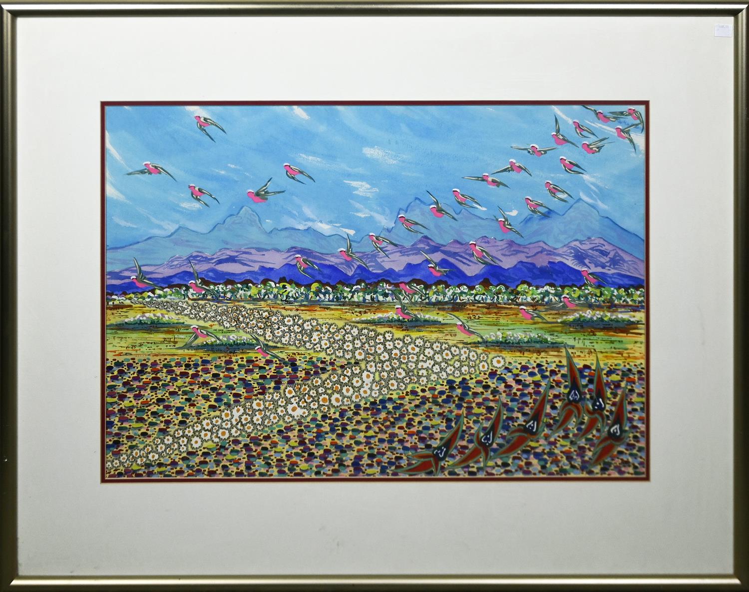 PETER STEVENSON, (GALAHS IN LANDSCAPE), WATERCOLOUR AND GOUACHE ON PAPER, SIGNED LOWER RIGHT, 48.5 X 71CM, FRAME SIZE: 77 X 99CM