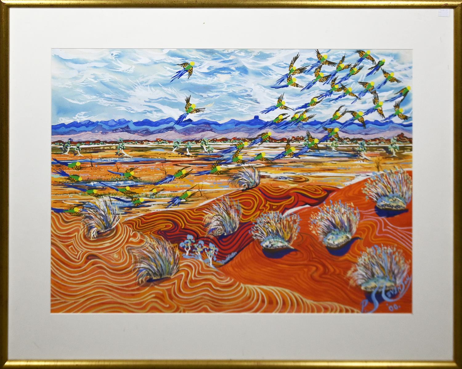 PETER STEVENSON, (PARROTS IN LANDSCAPE) 2000, WATERCOLOUR AND GOUACHE ON PAPER, SIGNED AND DATED LOWER RIGHT, 55 X 74.5CM, FRAME SIZE: 77 X 96CM