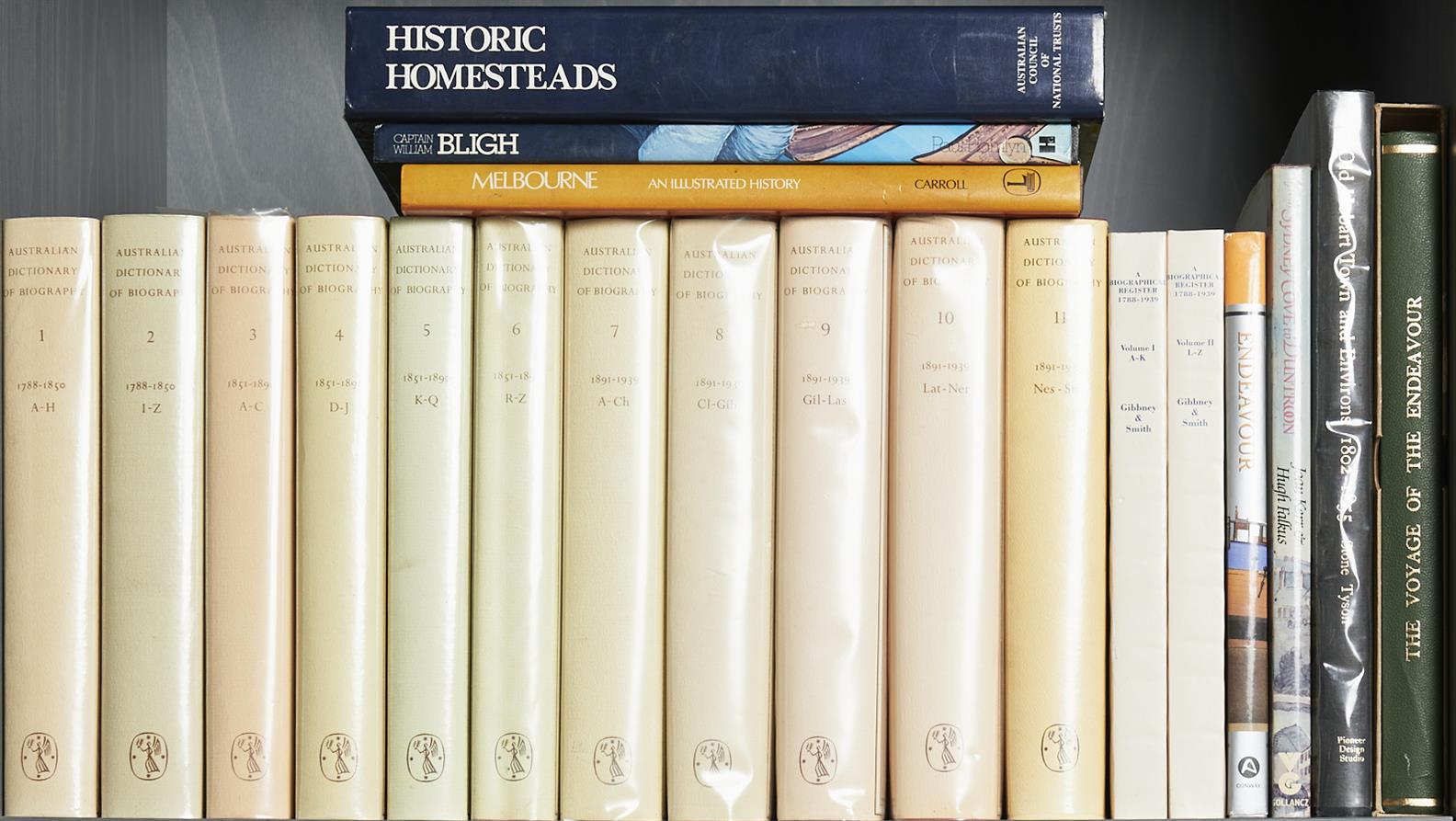 A SHELVE OF AUSTRALIAN HISTORY BOOKS, LEONARD JOEL DELIVERY SIZE: LARGE