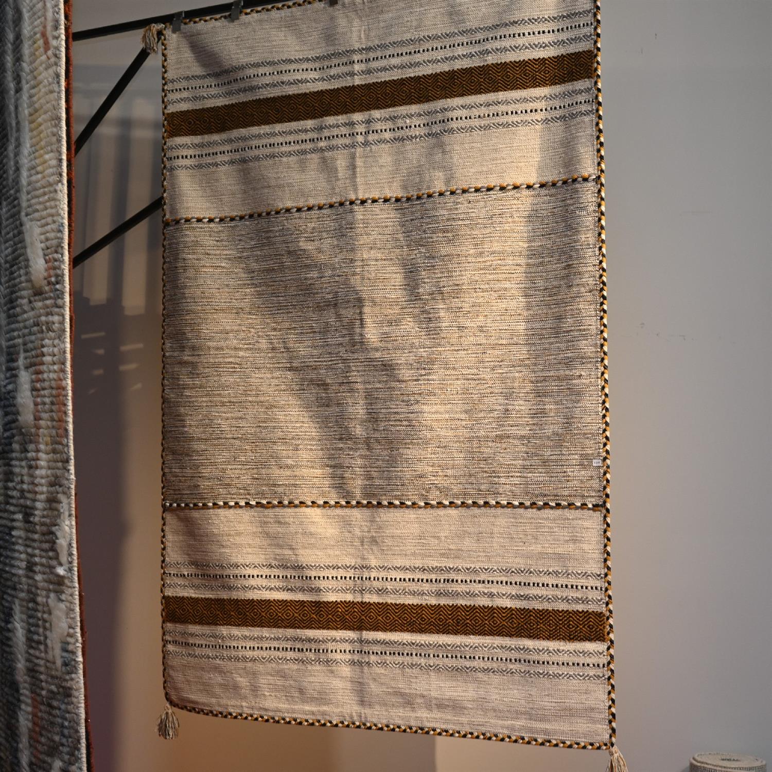 A NEW HAND-WOVEN DESIGNER MEXICAN-STYLE KILM WITH A GOOD BODY, HAND MADE WITH THE FINEST SOFT CHENILLE FLEECE, REVERSIBLE, IN TONES OF NATURAL CREAM, GOLD, AND GRAY WITH DECORATIVE TASSELLS. ORIGIN: JAIPYR RAJISTAN ( 230 X 160 CM) (LEONARD JOEL DELIVERY SIZE: LARGE)