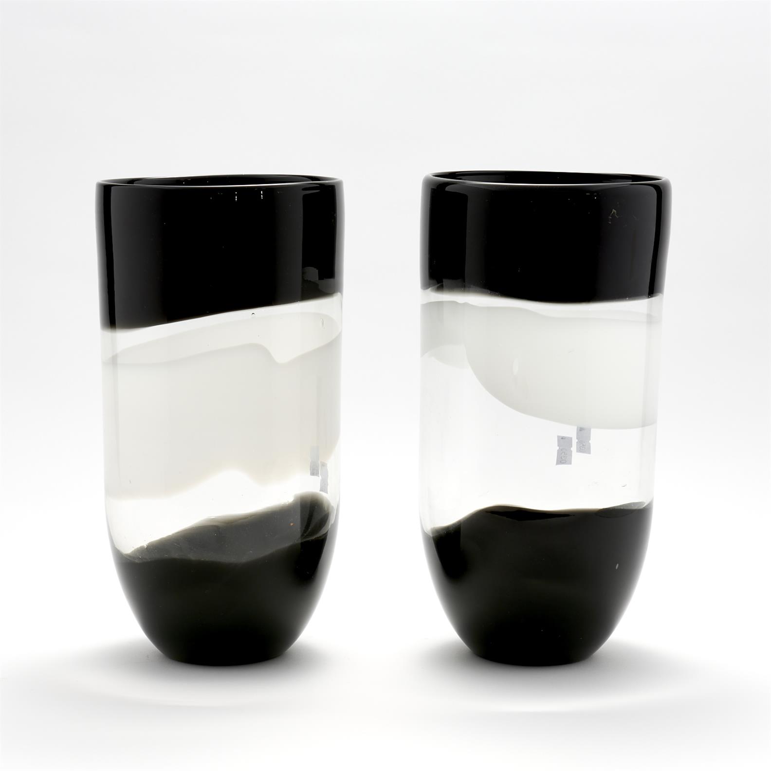 A PAIR OF MID-CENTURY GLASS VASES IN BLACK AND WHITE TONES H.32CM, LEONARD JOEL DELIVERY SIZE: LARGE