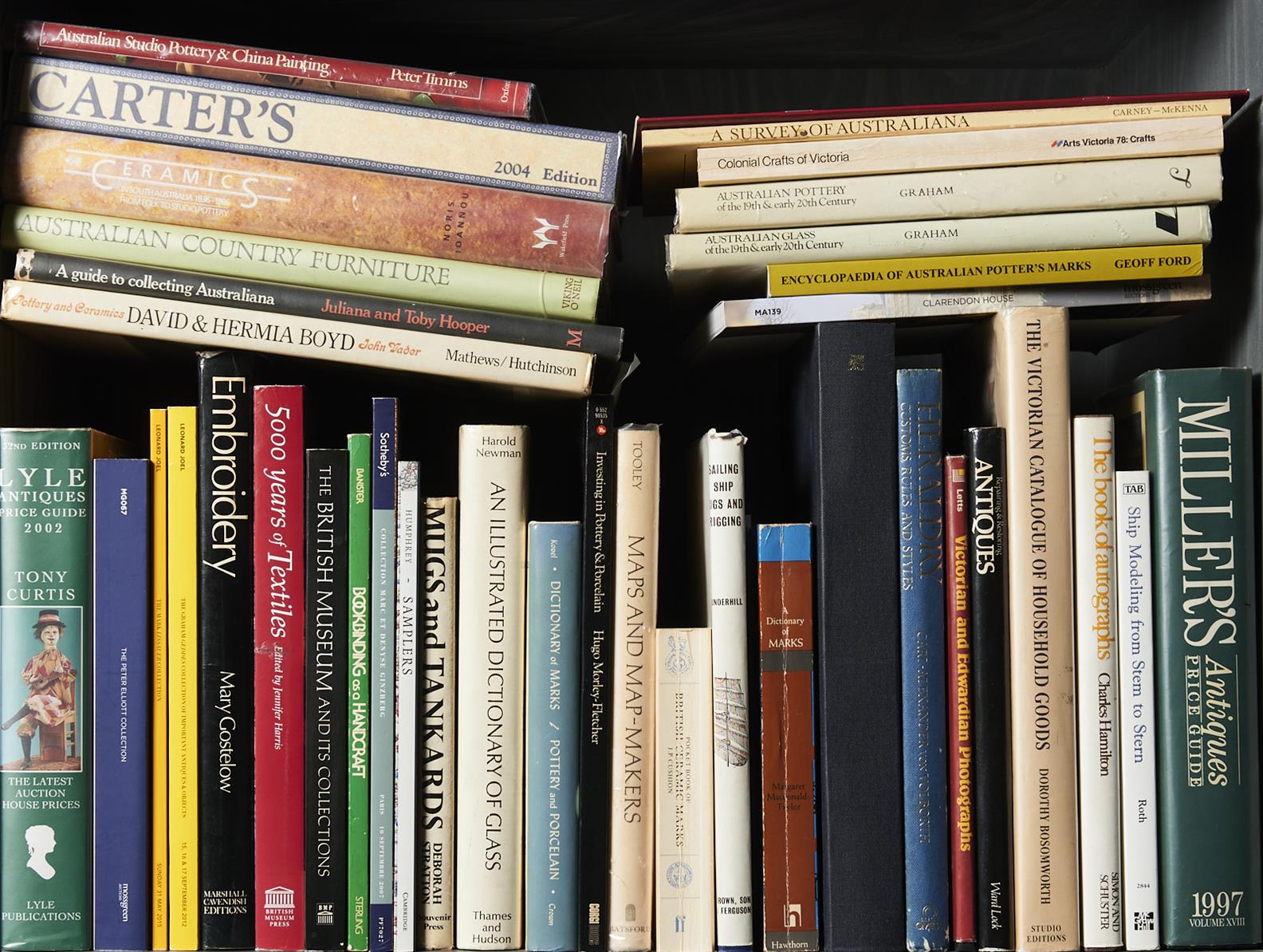 A SHELF OF COLLECTING REFERENCE BOOKS, INCLUDING AUSTRALIANA, LEONARD JOEL DELIVERY SIZE: LARGE