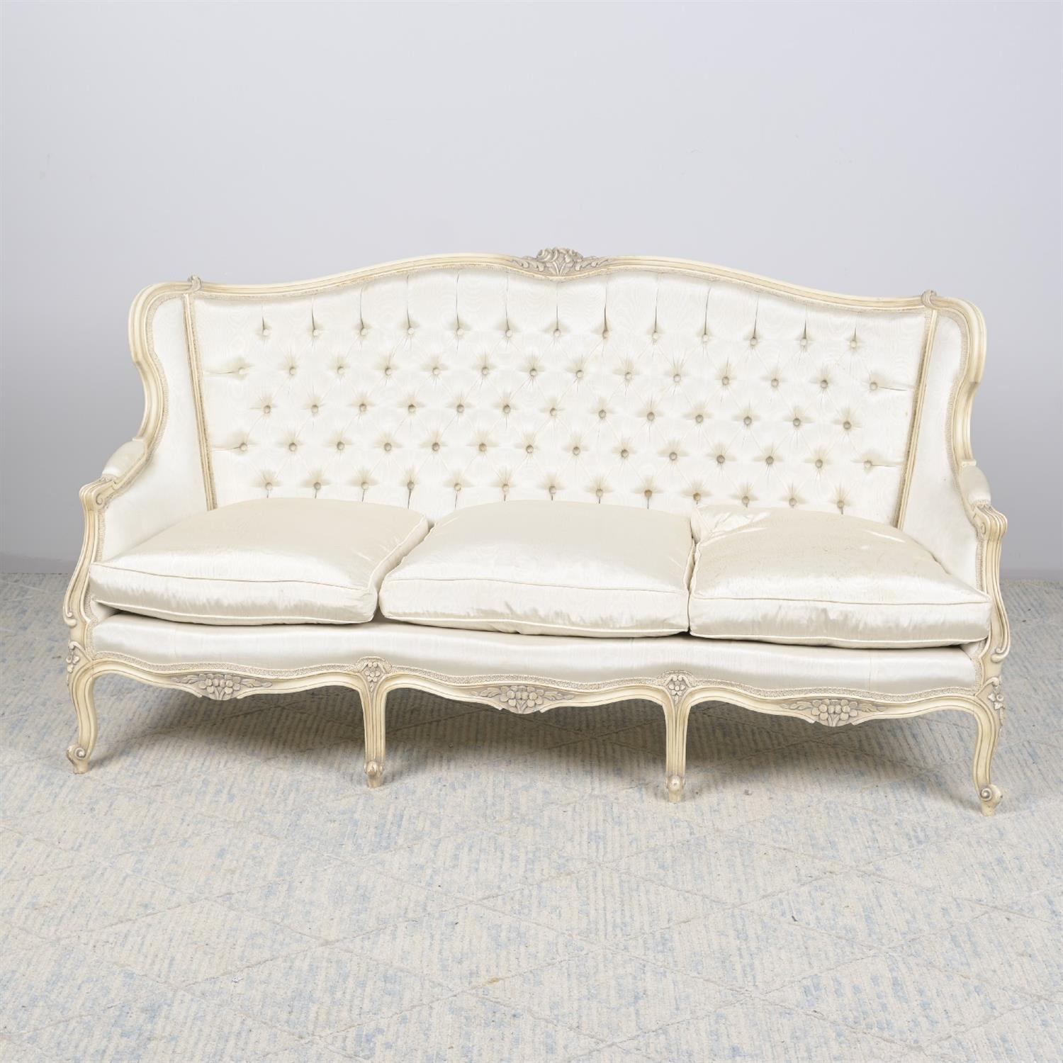 A LOUIS XV STYLE CREAM UPHOLSTERED SOFA (A/F) (95H X 180W X 62D CM) (THIS HEAVY ITEM MUST BE REMOVED BY CARRIERS AT THE CUSTOMER'S EXPENSE. LEONARD JOEL STAFF CANNOT ASSIST CARRYING THIS ITEM)