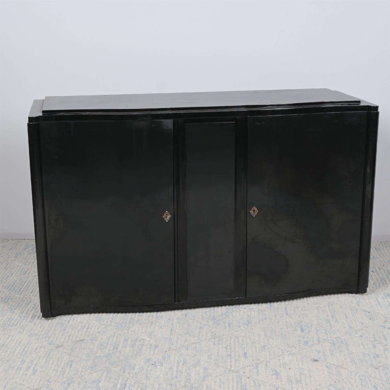 AN ART DECO STYLE BLACK LACQUERED SIDEBOARD (A/F) (85H X 140W X 50D CM) (THIS HEAVY ITEM MUST BE REMOVED BY CARRIERS AT THE CUSTOMER'S EXPENSE. LEONARD JOEL STAFF CANNOT ASSIST CARRYING THIS ITEM)