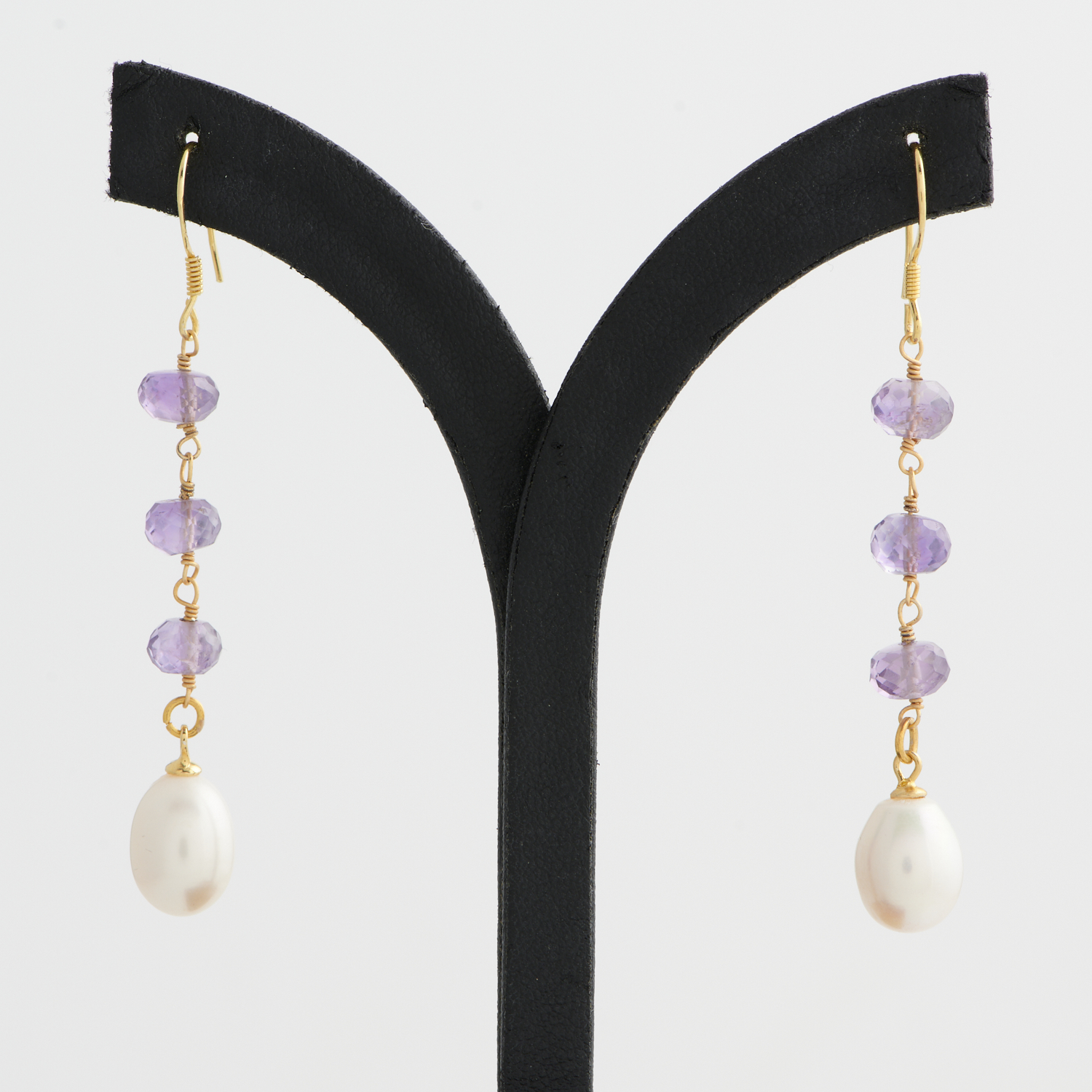 A PAIR OF AMETHYST AND PEARL DROP EARRINGS IN GOLD PLATE, TO SHEPHERD HOOK FITTINGS, 60MM