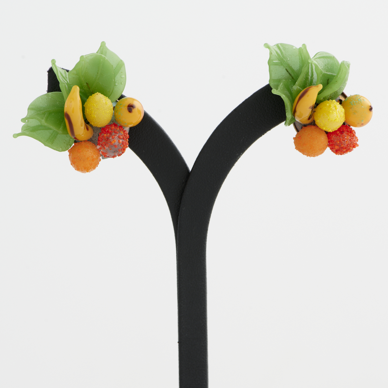 A PAIR OF VINTAGE ITALIAN MURANO GLASS TUTTI FRUTTI EARRINGS TO CLIP FITTINGS IN BASE METAL, 20MM X 35MM