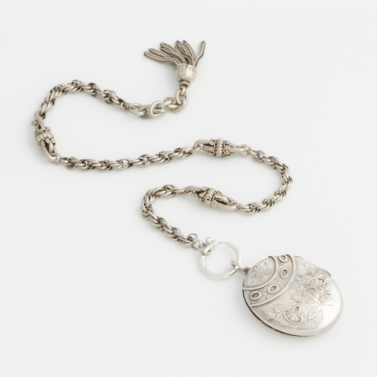 AN ANTIQUE FANCY LINK FOB CHAIN TO A VICTORIAN LOCKET IN SILVER, THE CHAIN MEASURING 330MM, LOCKET MEASURING 40MM X 32MM, A/F (LOCKET REQUIRES REPAIR)