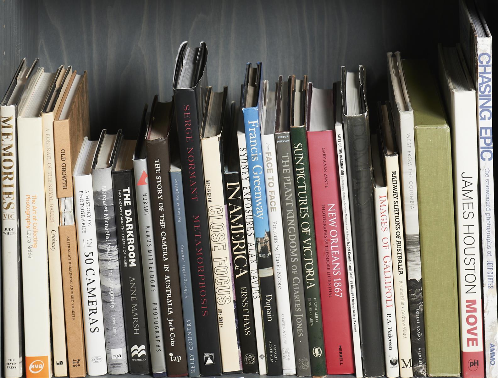 A SHELF OF PHOTOGRAPHY REFERENCE INCLUDING NOBLE 'THE ART OF COLLECTING PHOTOGRAPHY', JACK CATO 'THE STORY OF THE CAMERA IN AUSTRALIA', DAVID MOORE 'FACE TO FACE', DUPAIN, AND NORMONT, LEONARD JOEL DELIVERY SIZE: LARGE