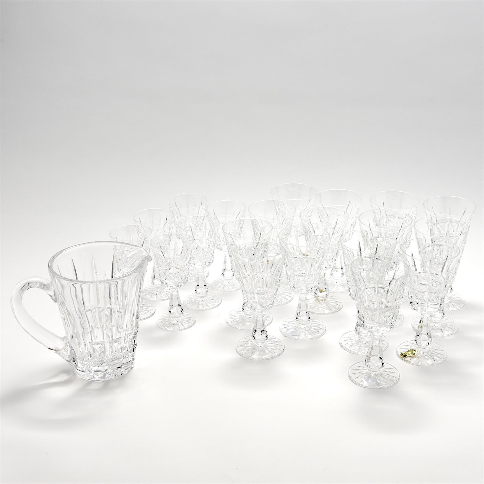A SUITE OF 20 WATERFORD CRYSTAL KYLEMORE PATTERN STEMWARE INCLUDING RED WINES, WHITE WINES AND SHERRIES TOGETHER WITH A JUG H.15.5CM (TALLEST), LEONARD JOEL DELIVERY SIZE: LARGE