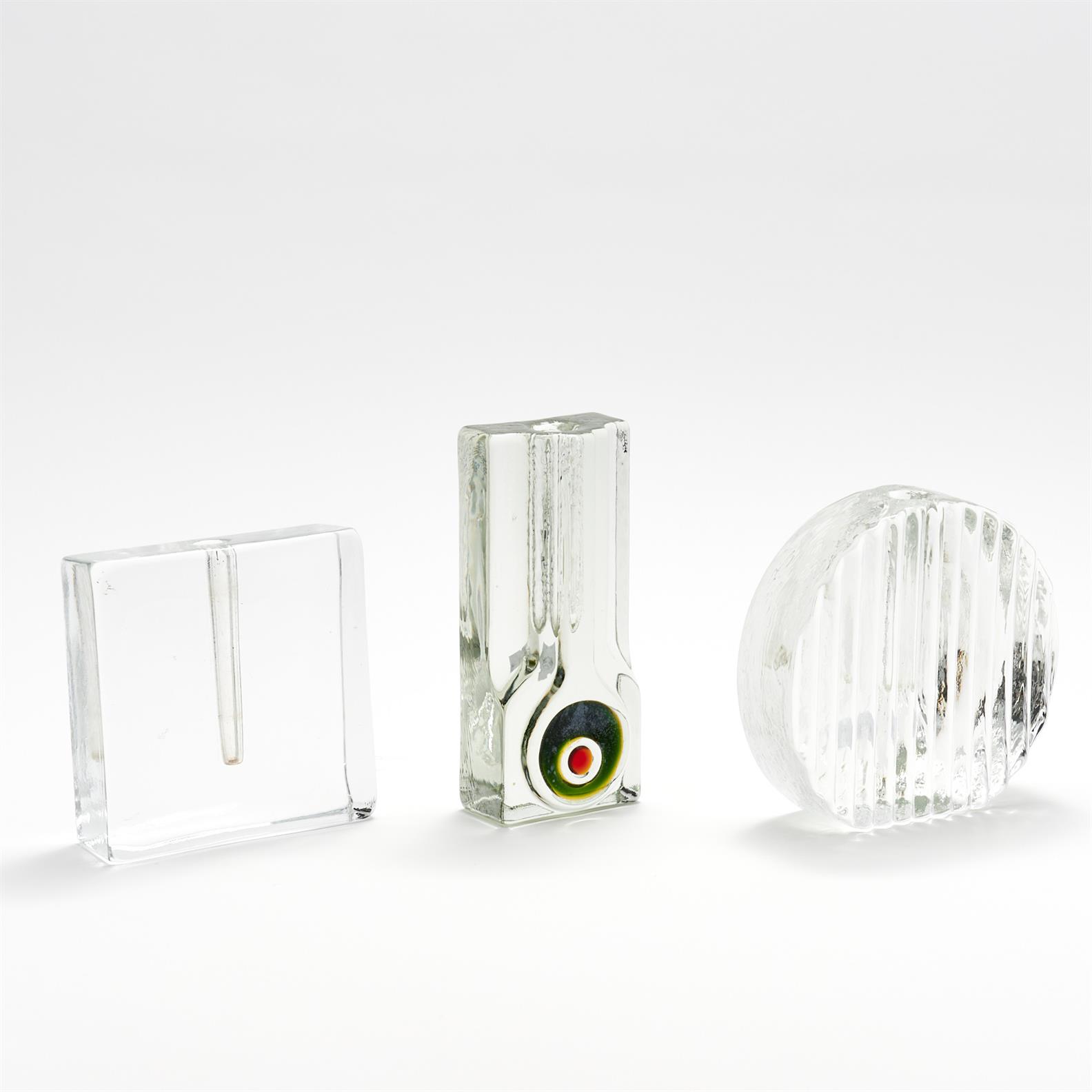 THREE MID-CENTURY SOLID GLASS SINGLE STEM VASES H.16CM (TALLEST), LEONARD JOEL DELIVERY SIZE: MEDIUM