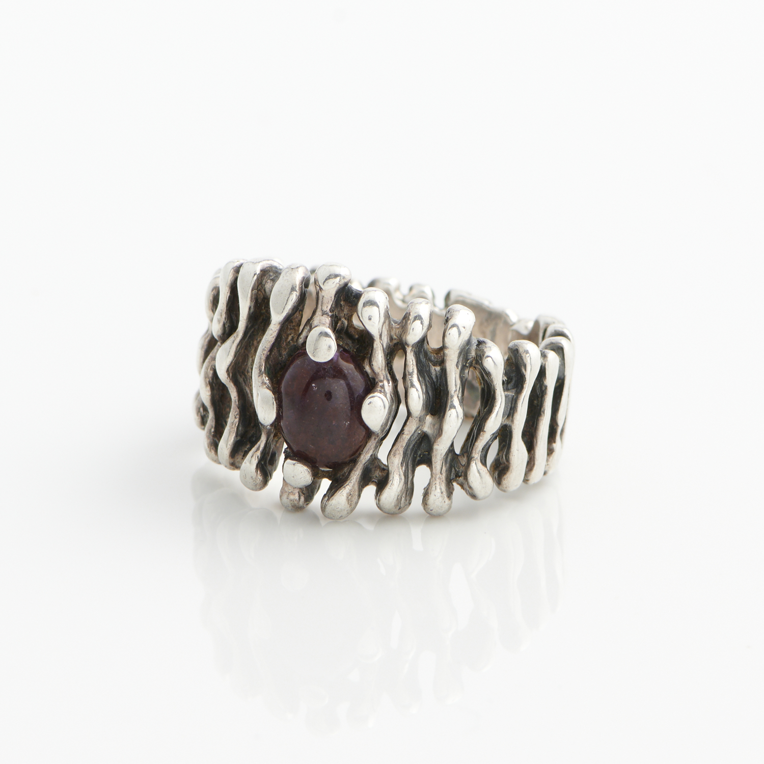 A MODERNIST AMETHYST RING IN STERLING SILVER, SIZE I