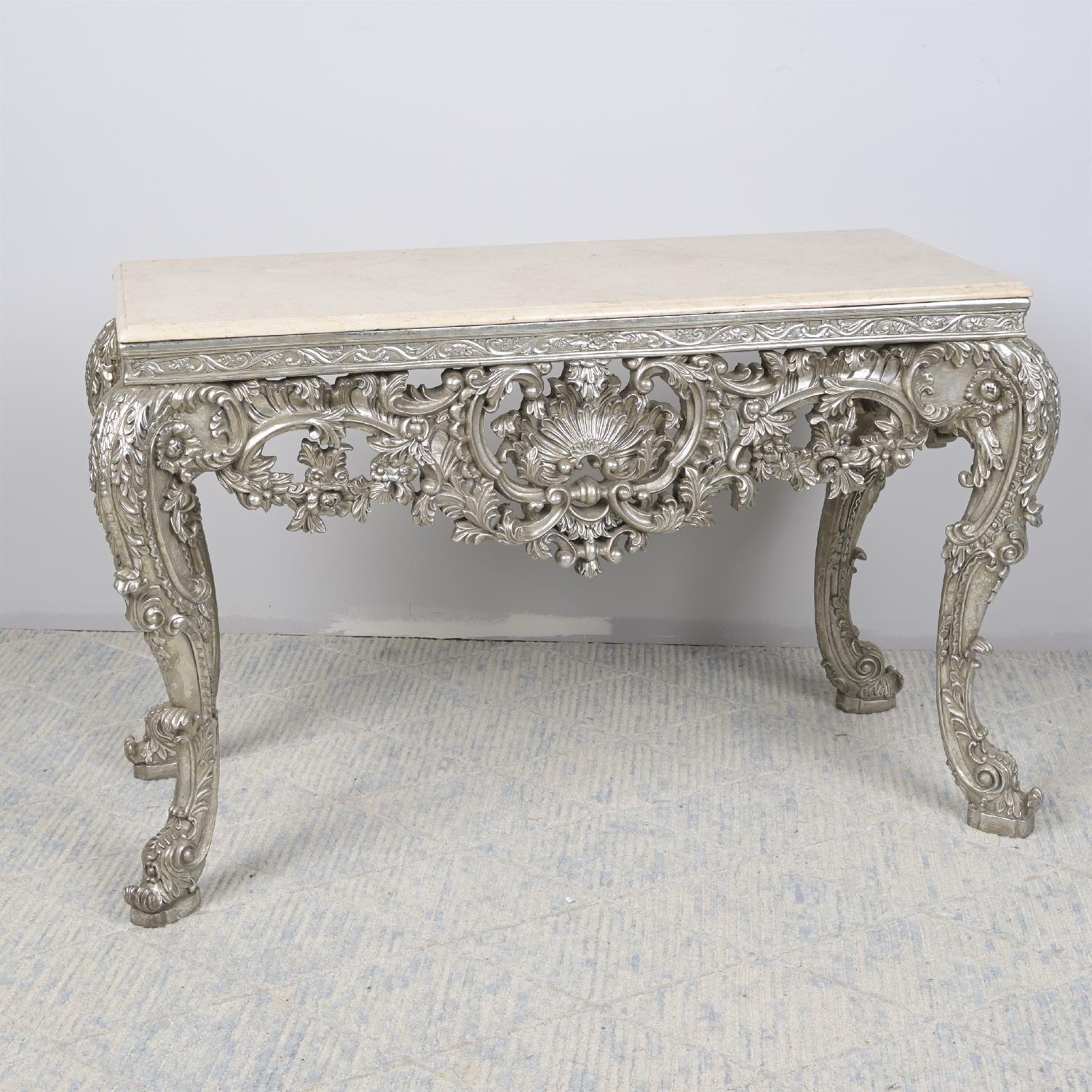 A GEORGE II-STYLE SILVERED RESIN SIDE TABLE, WITH A MARBLE TOP (86H X 138W X 62D CM) (THIS HEAVY ITEM MUST BE REMOVED BY CARRIERS AT THE CUSTOMER'S EXPENSE. LEONARD JOEL STAFF CANNOT ASSIST CARRYING THIS ITEM)