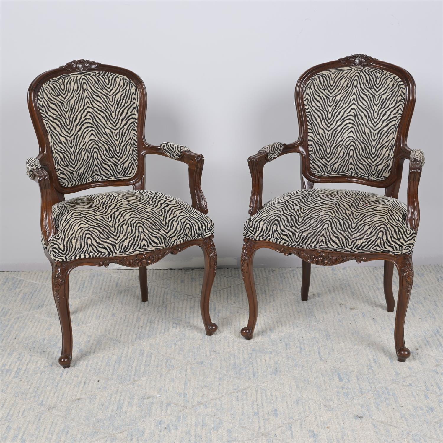 A PAIR OF LOUIS XV-STYLE FAUTEUILS UPHOLSTERED IN ZEBRA PATTERNED FABRIC (100H X 62W X 55D CM) (LEONARD JOEL DELIVERY: LARGE)