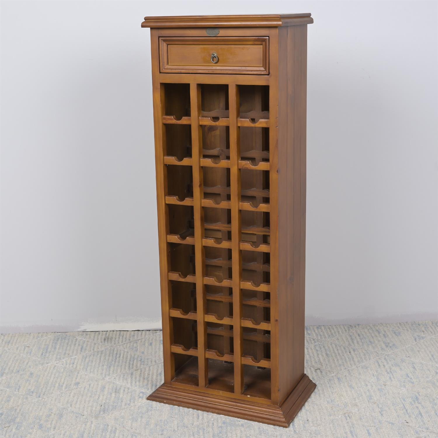 A HARDWOOD 30 BOTTLE WINERACK WITH SINGLE DRAWER (A/F) (135H X 49W X 30D CM) (LEONARD JOEL DELIVERY: LARGE)