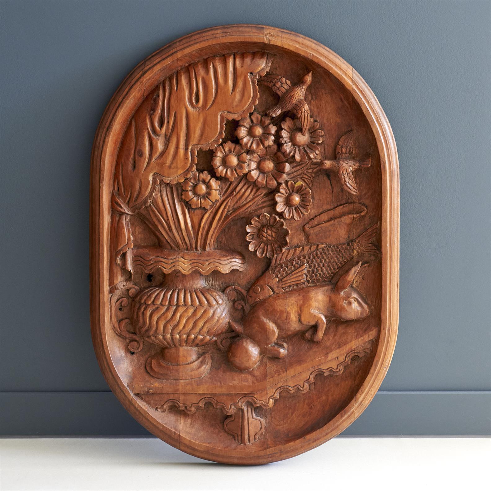 A LARGE RELIEF CARVED HARDWOOD WALL PANEL WITH FLOWERS, BIRDS AND ANIMALS H.100CM, LEONARD JOEL DELIVERY SIZE: X-LARGE