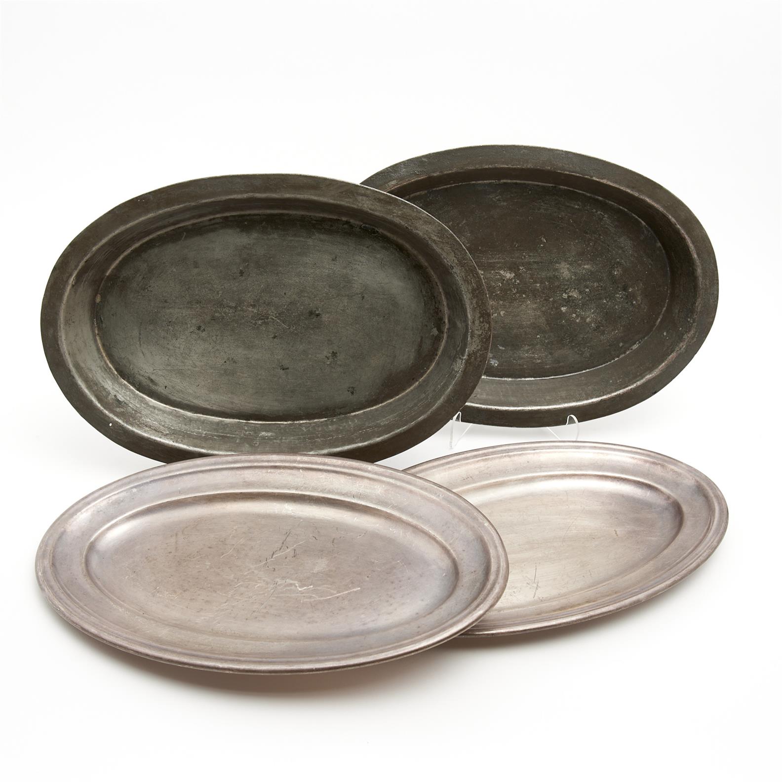 A PAIR OF HEAVY VINTAGE NICKEL ON COPPER DISHES TOGETHER WITH A PAIR OF PEWTER DISHES, L.41CM (LONGEST) LEONARD JOEL DELIVERY SIZE: LARGE
