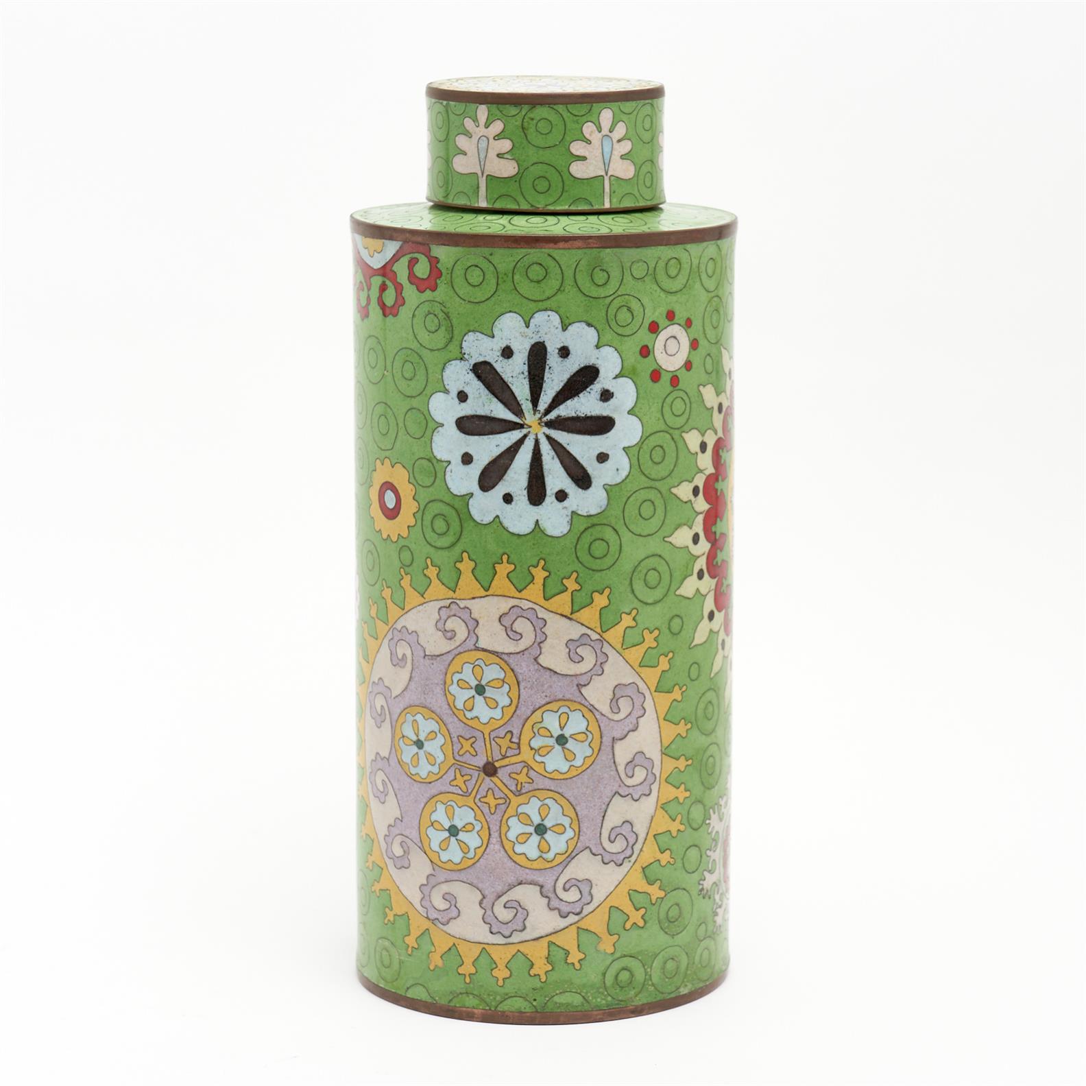 A LARGE CYLINDRICAL CLOISONNE CANISTER BY FABIENNE JOUVIN PARIS H.35CM, LEONARD JOEL DELIVERY SIZE: MEDIUM