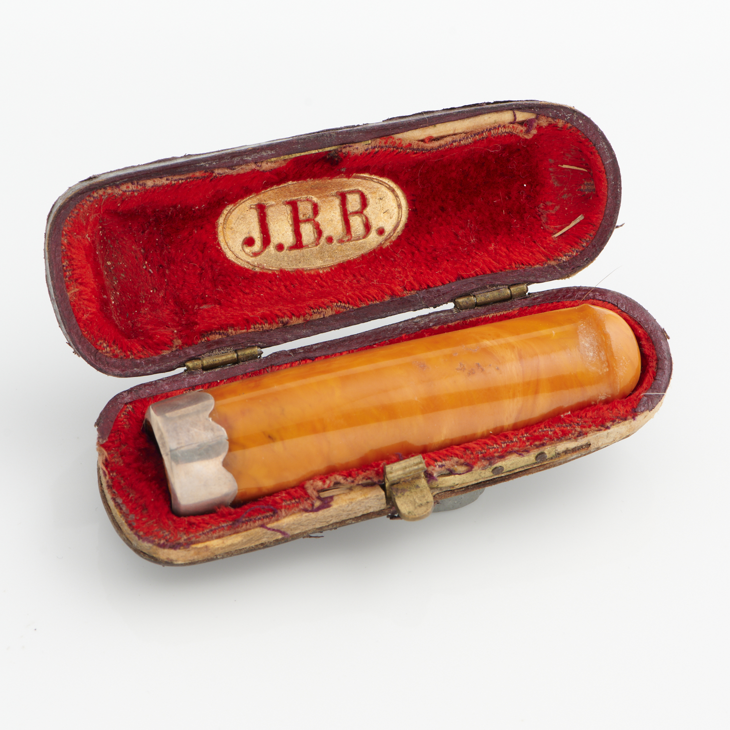 AN AMBER CIGAR HOLDER IN SILVER, CHESTER HALLMARKS, CIRCA 1903, ACCOMPANIED BY A FITTED BOX, 66MM X 11MM, ENGRAVED J.B.B