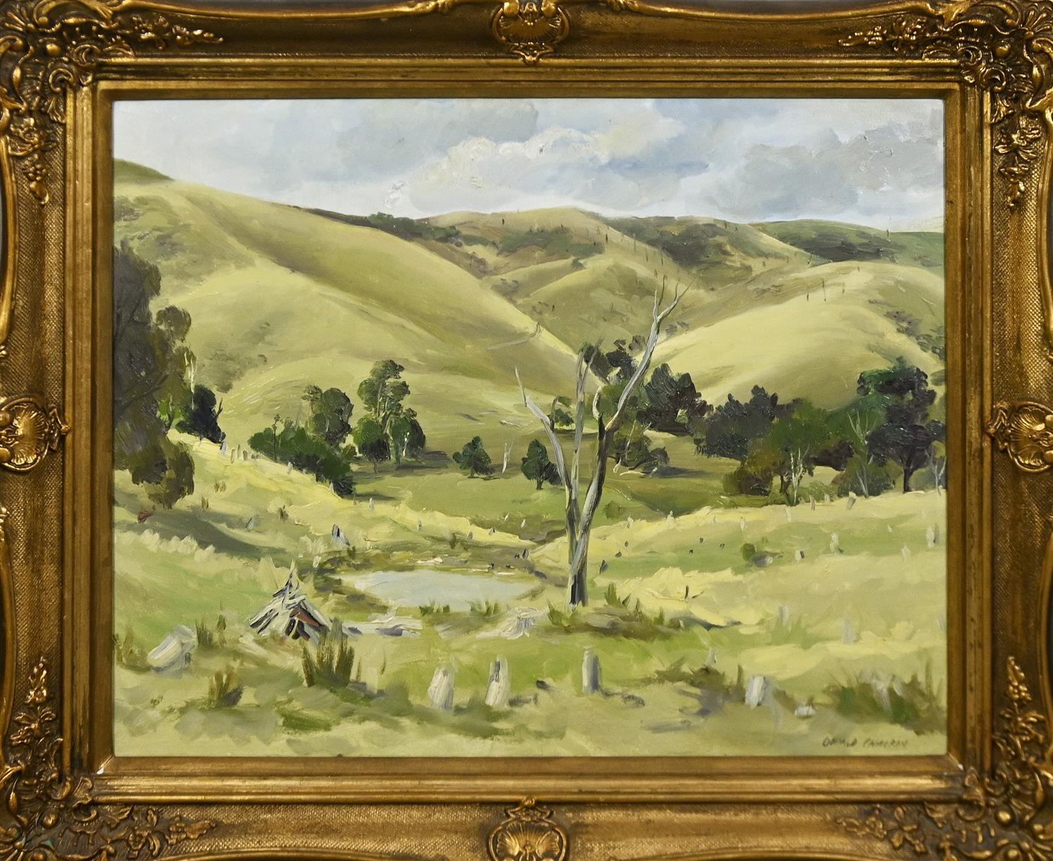 DONALD CAMERON, GUMS & SHEEP, OIL ON CANVASBOARD, SIGNED LOWER LEFT, TITLED VERSO, 39 X 49CM, FRAME SIZE: 59 X 69CM