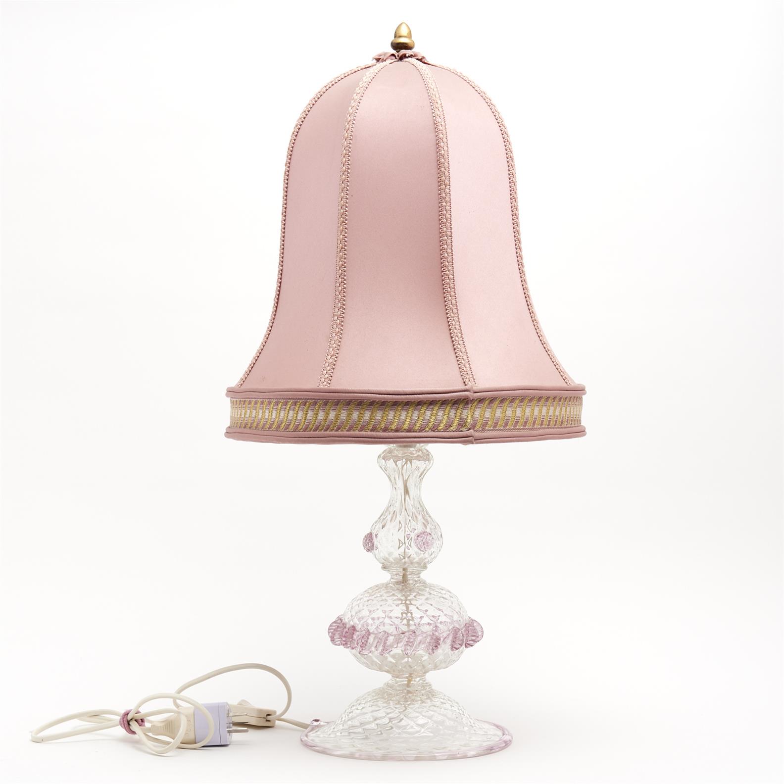 A MURANO LAMP BASE WITH PINK GLASS TRIMMING AND FLOWERS AND VINTAGE SHADE H.64CM (INCLUDING SHADE), LEONARD JOEL DELIVERY SIZE: LARGE