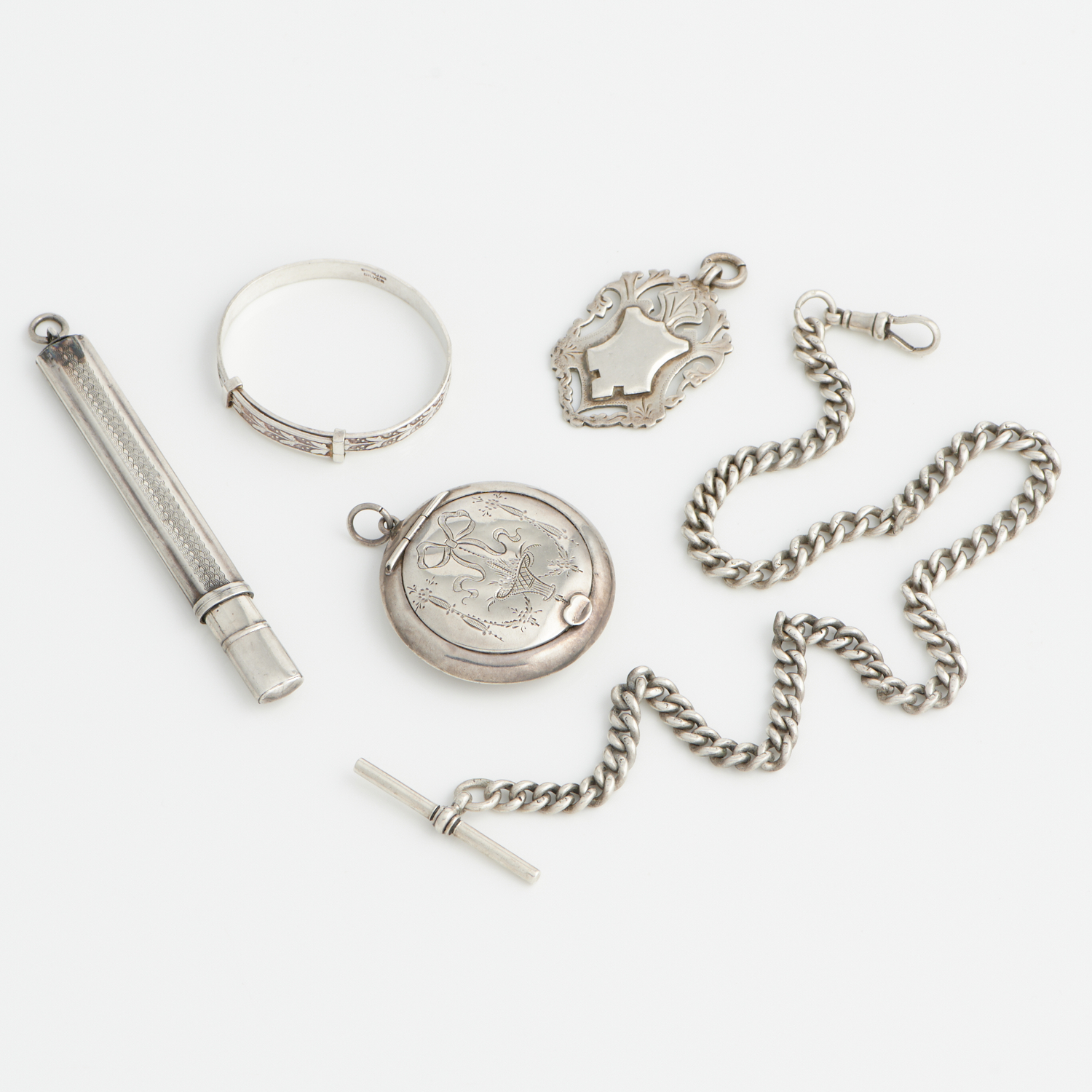 A COLLECTION OF SILVER INCLUDING A CHAIN TO A T-BAR, A LOCKET, A SHIELD PENDANT, A CHILDREN'S BRACELET AND A CASED PENCIL