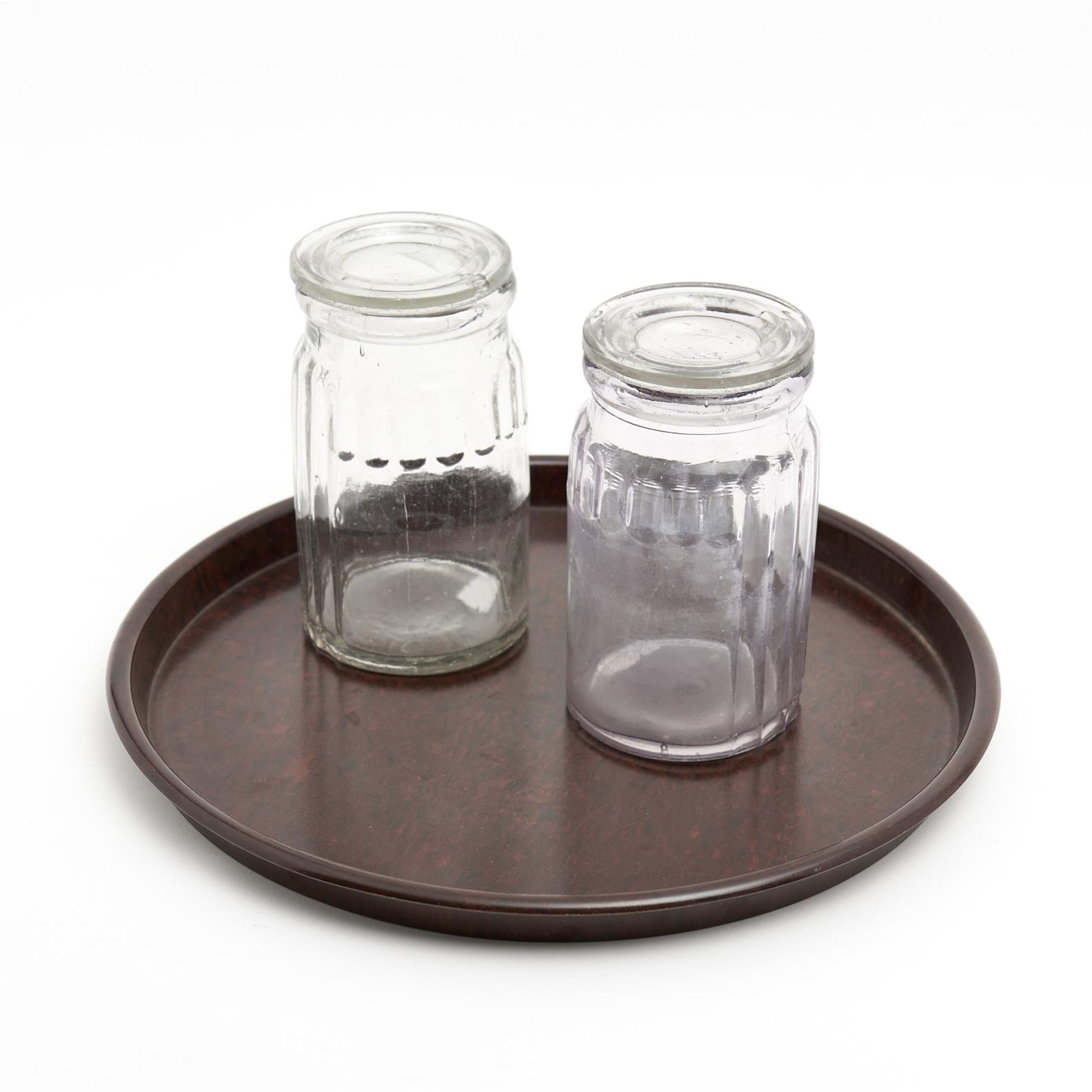 A CIRCULAR BAKELITE TRAY TOGETHER WITH TWO VINTAGE GLASS JARS DIA.35.5CM (LARGEST), LEONARD JOEL DELIVERY SIZE: MEDIUM