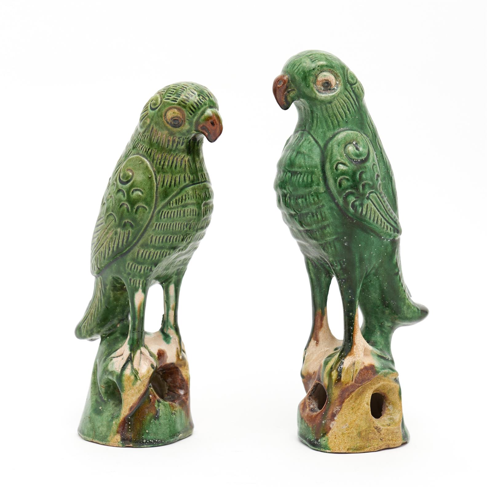 TWO CHINESE CERAMIC PARROT INCENSE BURNERS H.23.5CM, LEONARD JOEL DELIVERY SIZE: MEDIUM