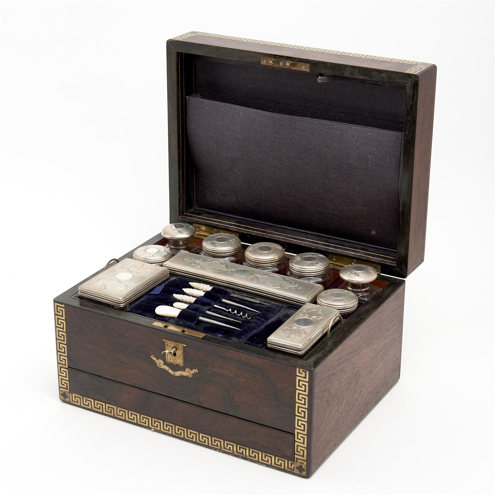 A VICTORIAN MOTHER-OF-PEARL INLAID TRAVELLING VANITY SET WITH SILVER PLATE AND CRYSTAL CANISTERS W.30.5CM, LEONARD JOEL DELIVERY SIZE: MEDIUM